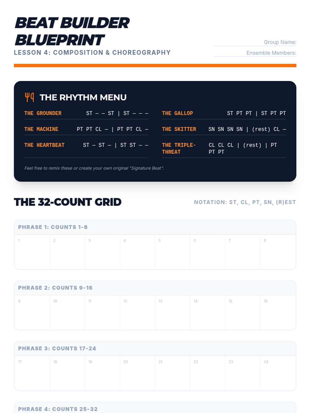 Small groups collaborate to compose and notate a 32-count body percussion routine. Students apply their knowledge of layers and sounds to create original work.