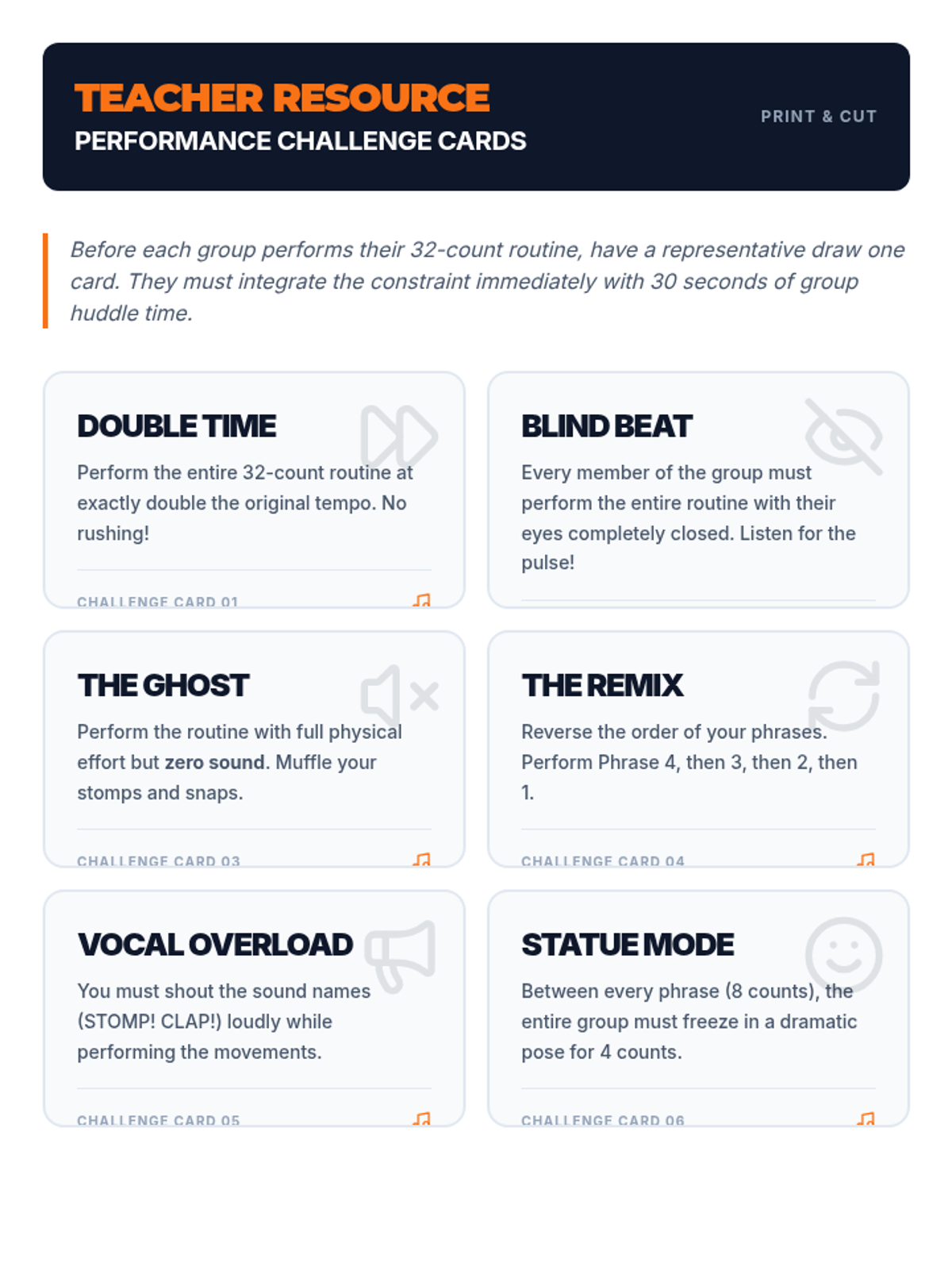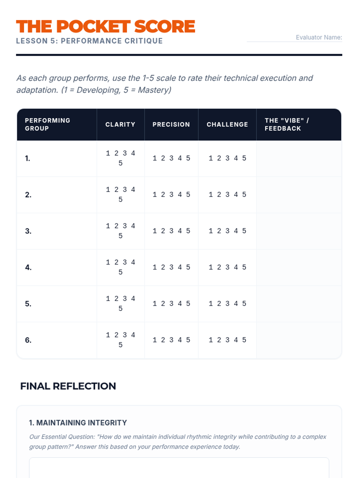 The culmination of the unit where groups perform their compositions and undergo a 'Performance Challenge' with random constraints. Focuses on performance quality and rhythmic 'pocket'.