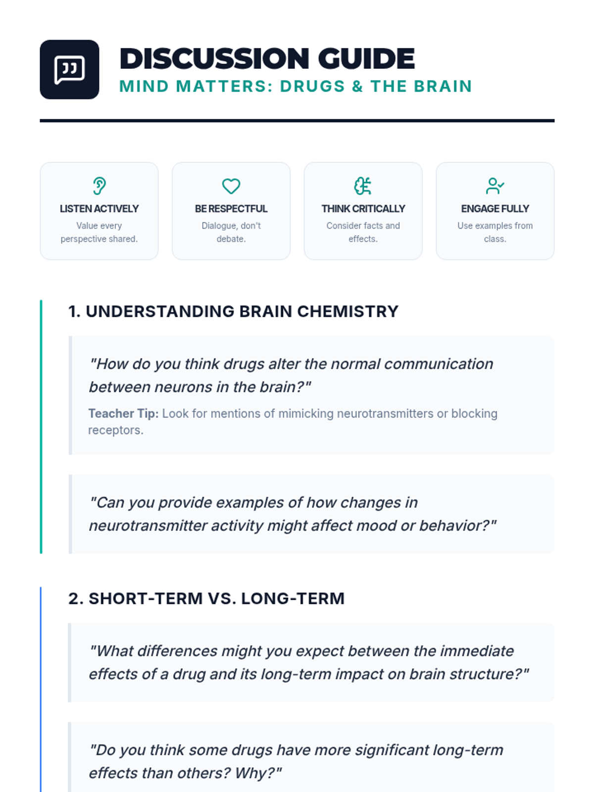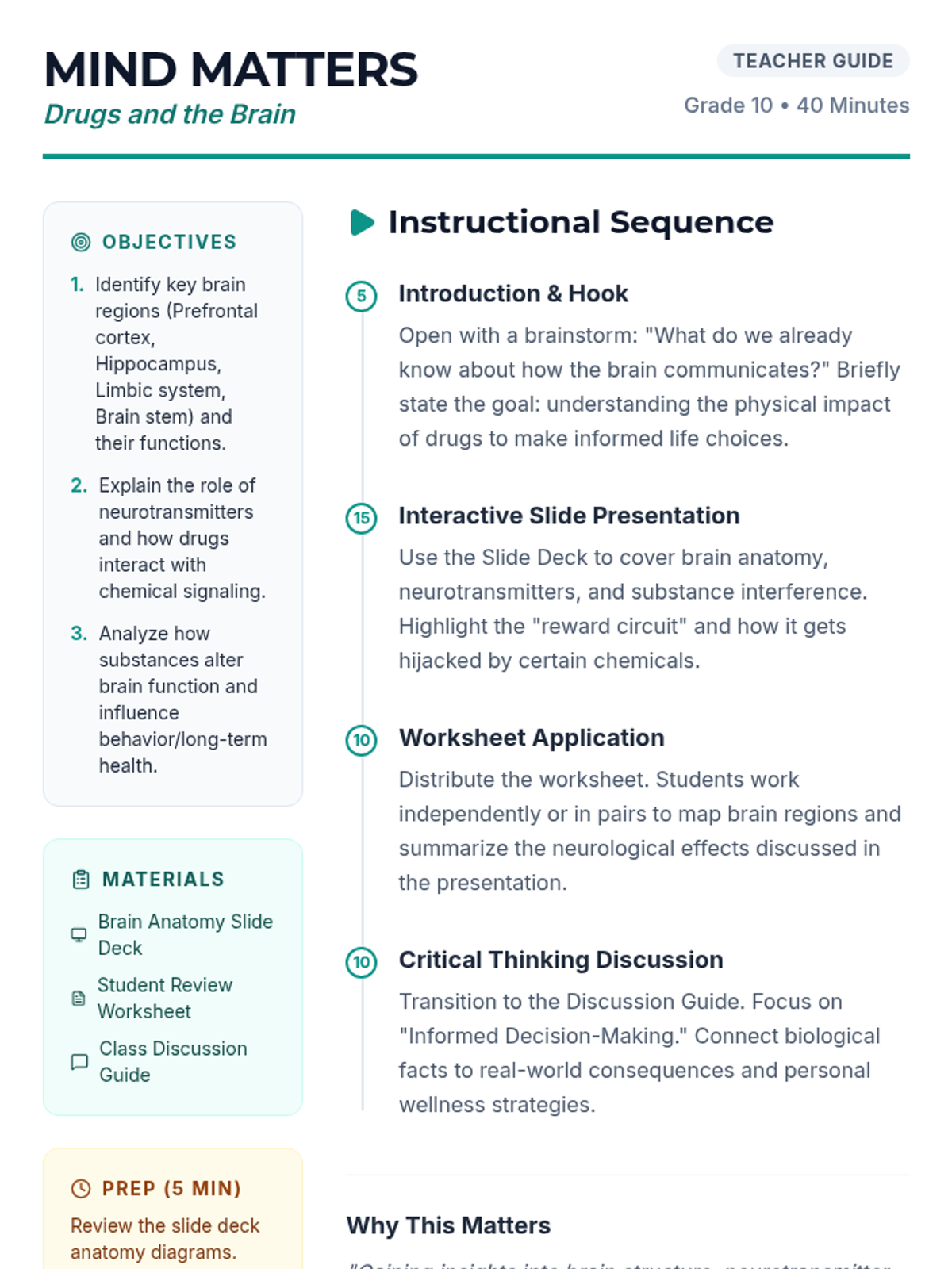 A 45-minute evidence-informed lesson for secondary students focusing on substance use awareness, brain development, harm reduction, and decision-making skills through a non-judgmental lens.