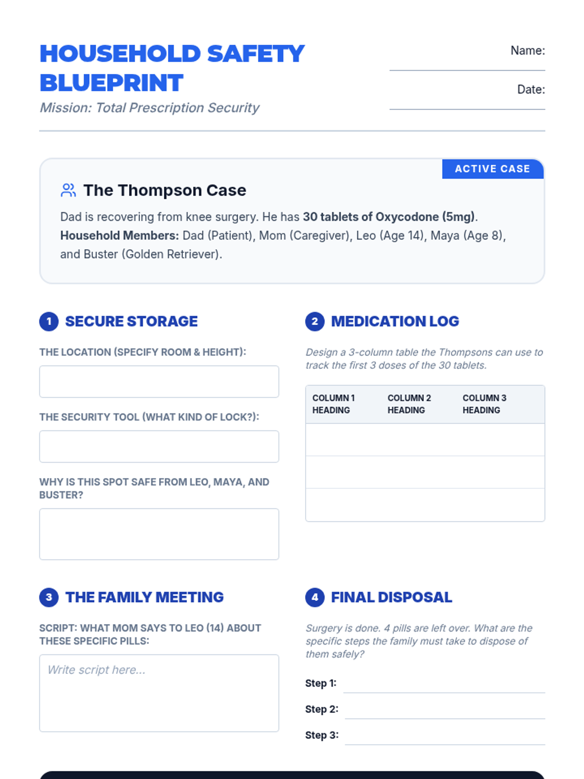Applying unit knowledge to create a comprehensive household safety plan for managing a fictional post-surgery opioid prescription.