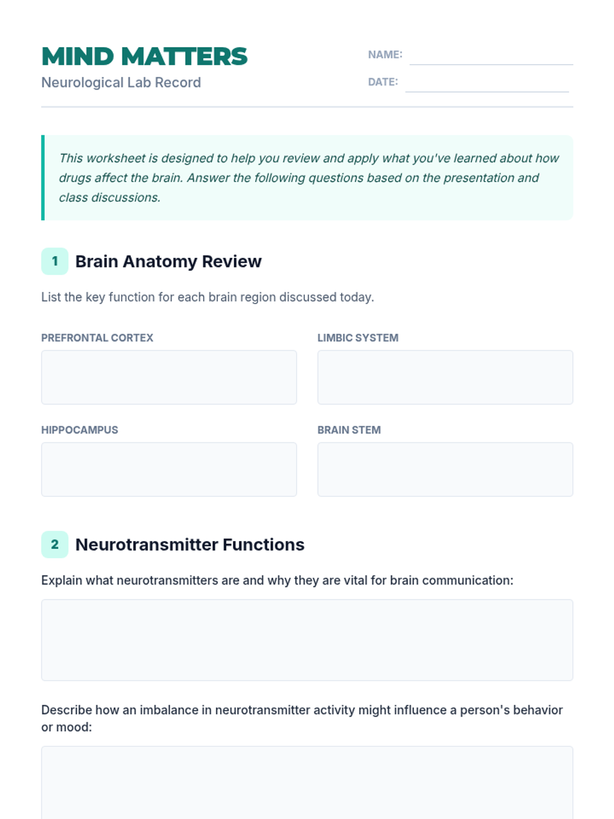 This lesson for 10th graders explores how drugs affect the brain, emphasizing the importance of understanding the impact of substance use on mental and physical health. Students learn about brain anatomy, neurotransmitter roles, and the neurological consequences of substance use to foster informed decision-making.