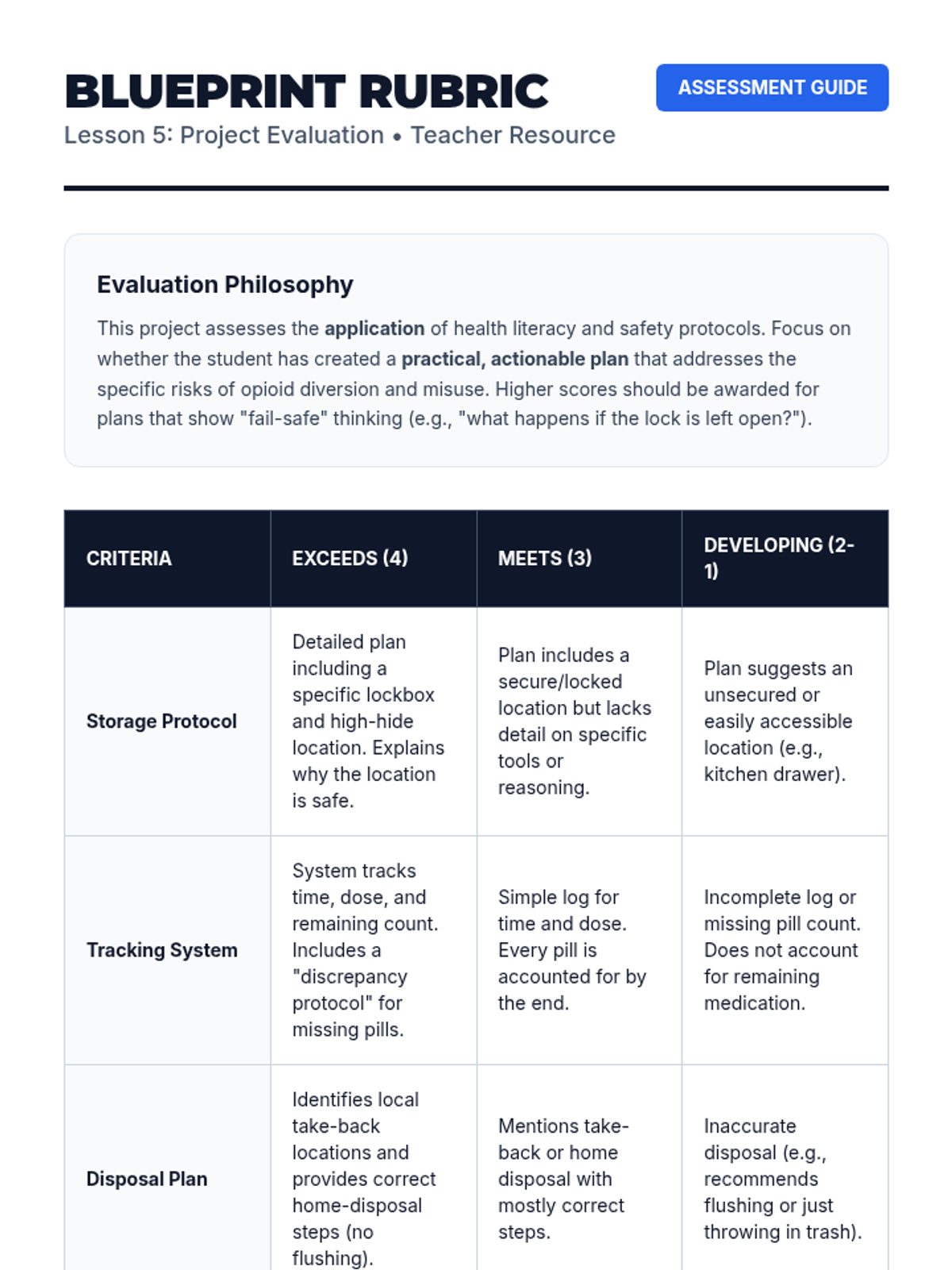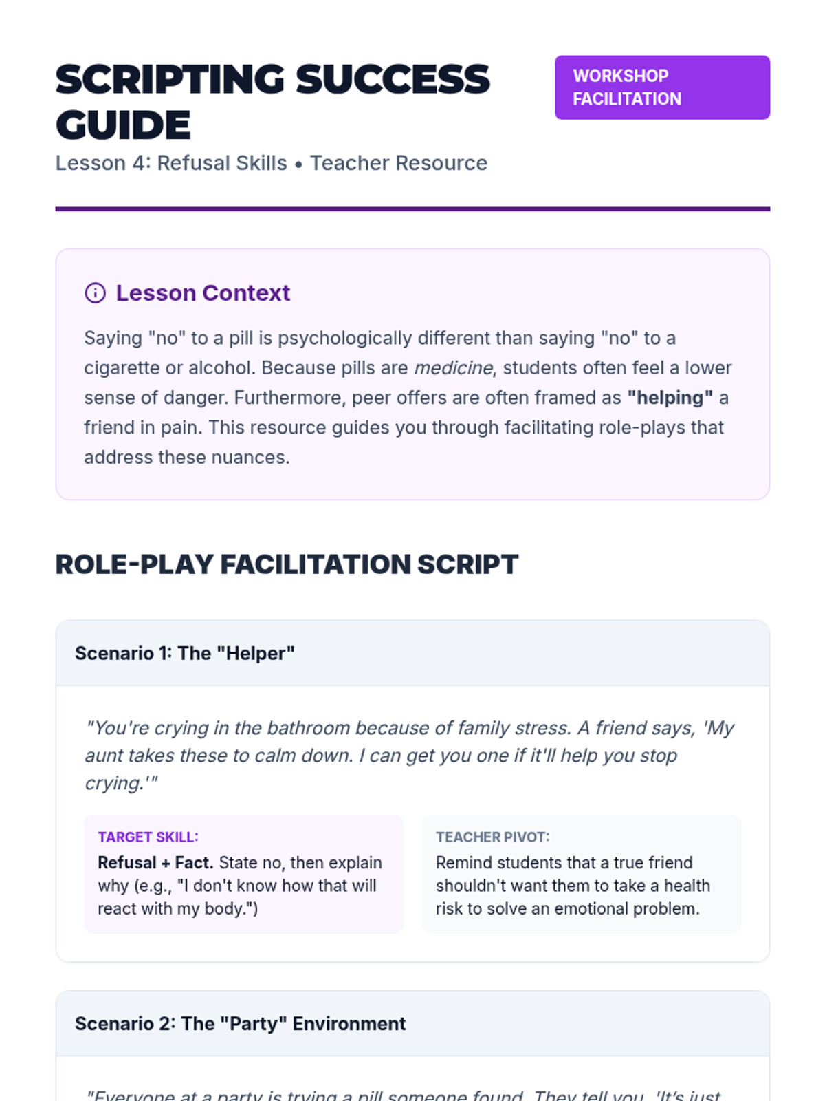 Prescription Drug AwarenessIdentification of common stimulants, depressants, and opioids alongside the physiological effects of misuse. Equips students with refusal skills and protocols for emergency overdose response.