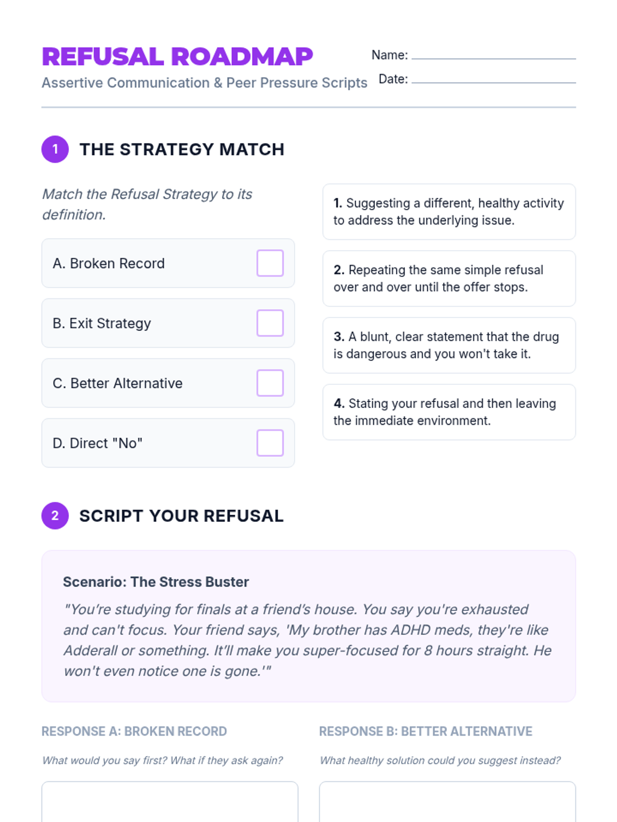 Refusing Peer PressureIdentifies common peer pressure tactics and builds assertive communication skills to set healthy boundaries. Equips students with specific refusal strategies for social situations and high-risk scenarios.