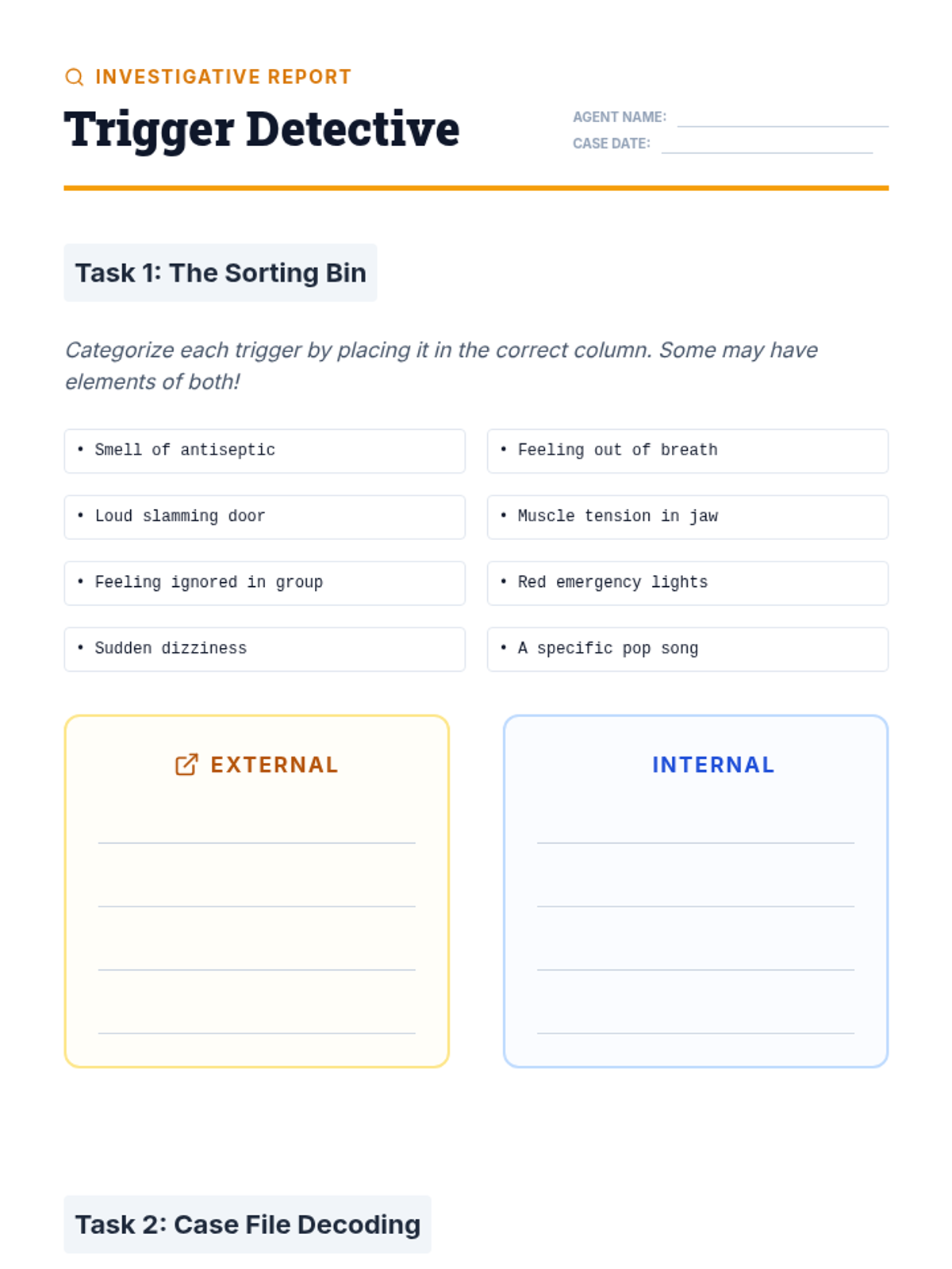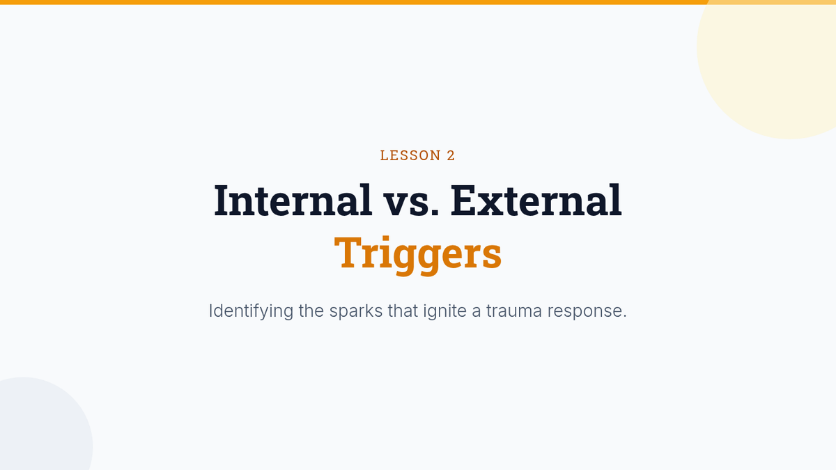Explores the difference between internal and external triggers, teaching students to identify specific cues that activate a trauma response.