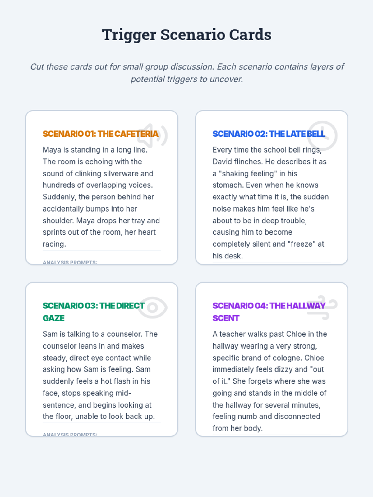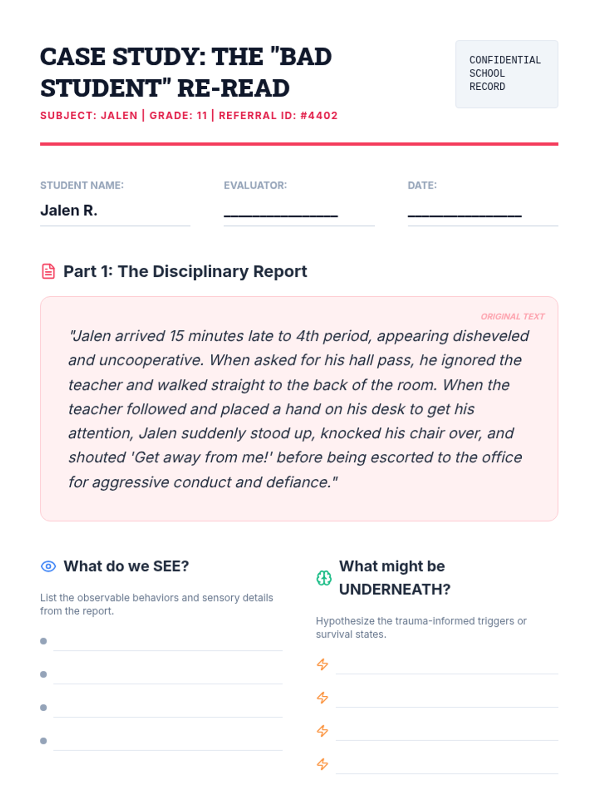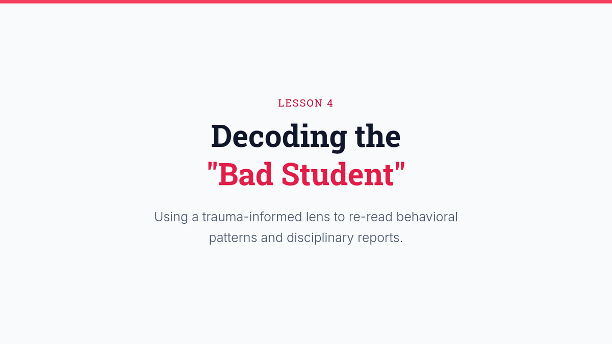 Applies a trauma-informed lens to behavioral patterns, teaching students to decode 'challenging' behaviors as trauma responses.