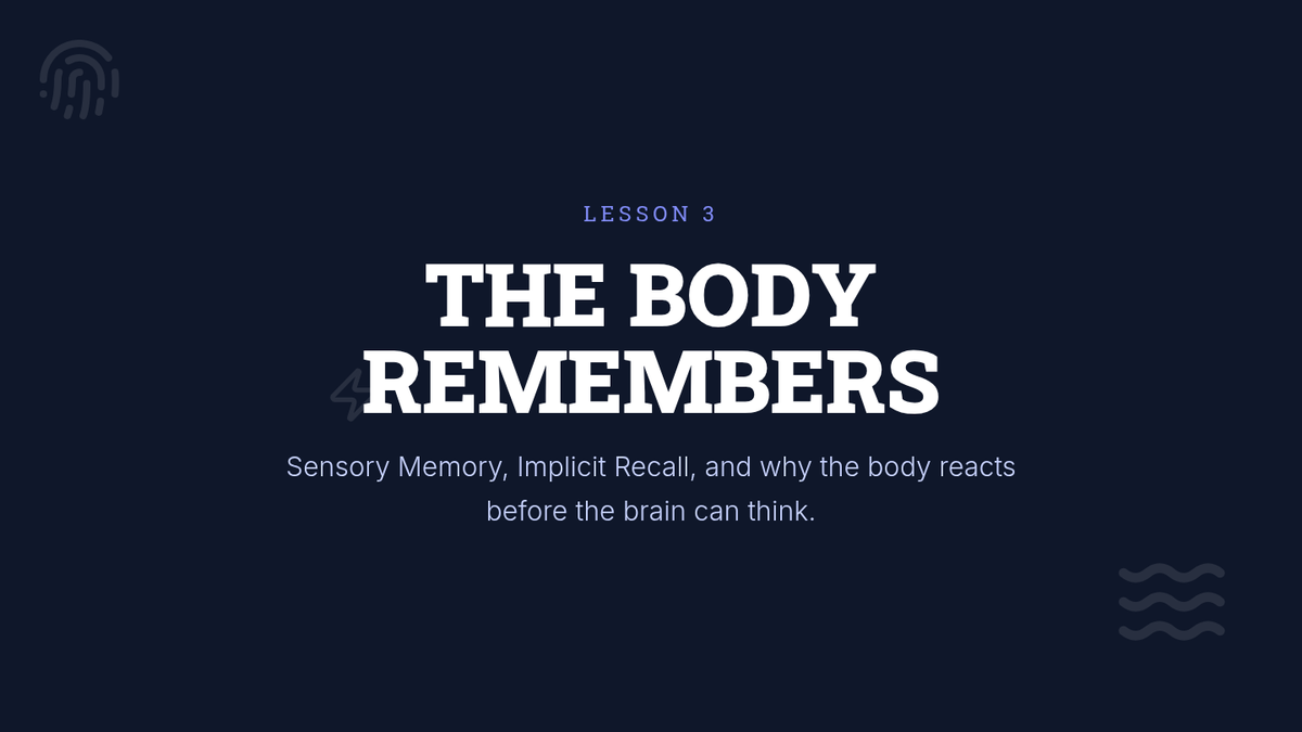 Investigates sensory memory and the difference between implicit and explicit recall, focusing on how the body reacts to triggers before the conscious mind.