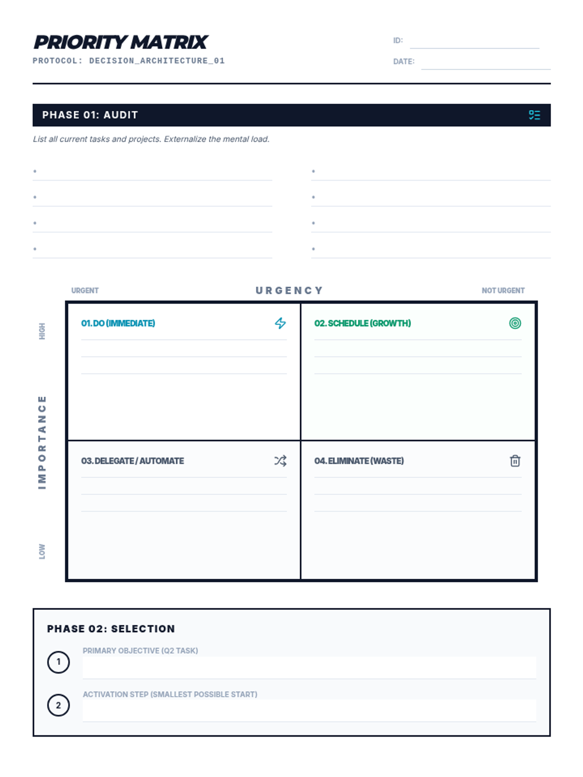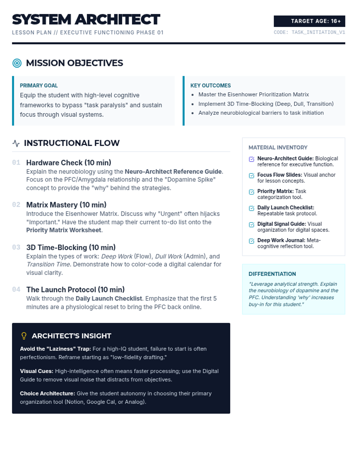 A comprehensive lesson for high-achieving teens to master task initiation and attention through the Eisenhower Matrix, time-blocking, and digital system design.