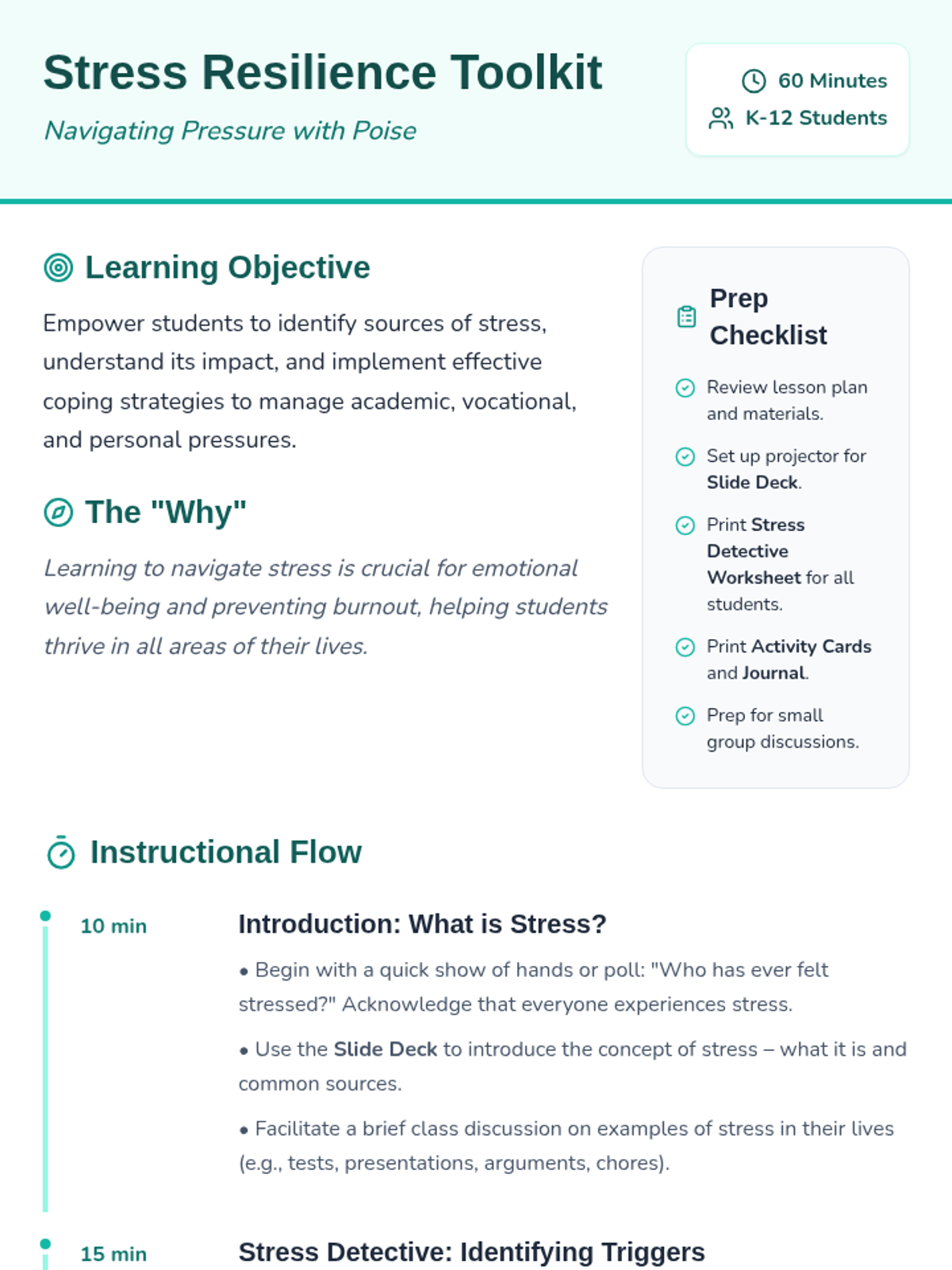 This lesson provides students with a comprehensive toolkit to identify sources of stress, understand its impact, and implement effective coping strategies to manage pressure and prevent burnout.