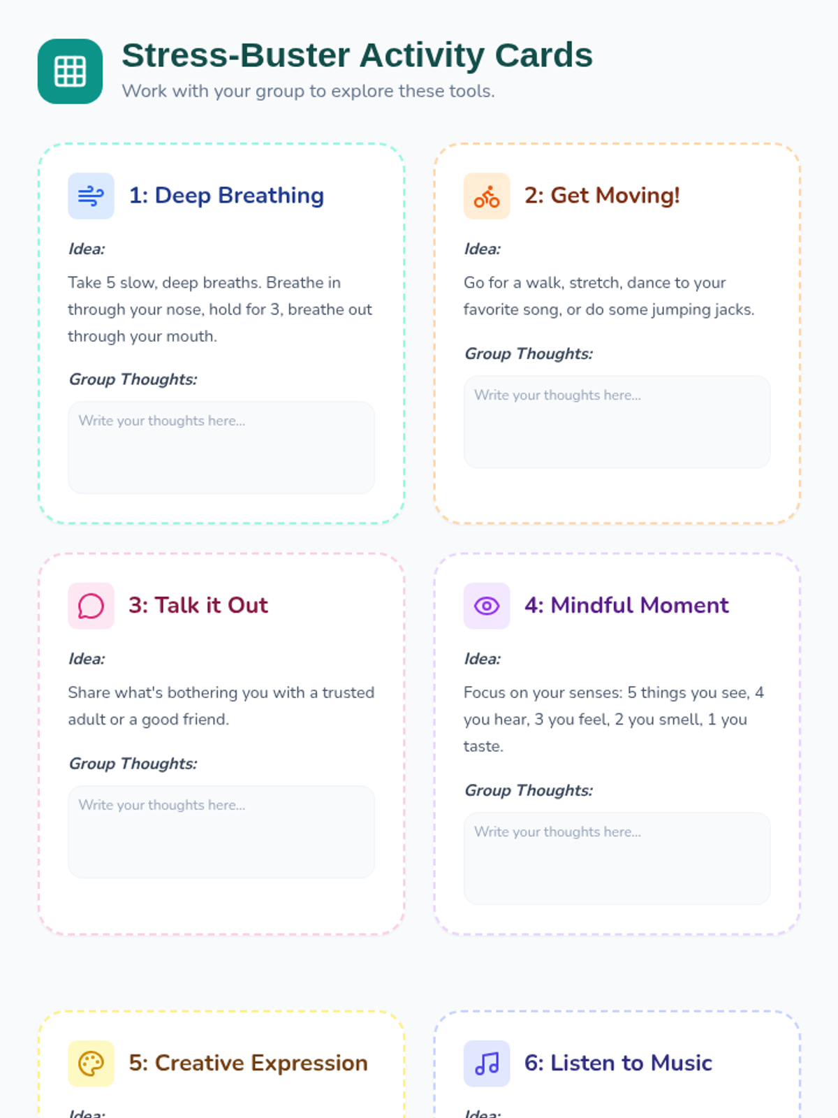 Students will explore a variety of sensory and cognitive coping strategies. They will evaluate which techniques work best for them and begin building their personal 'Coping Menu'.