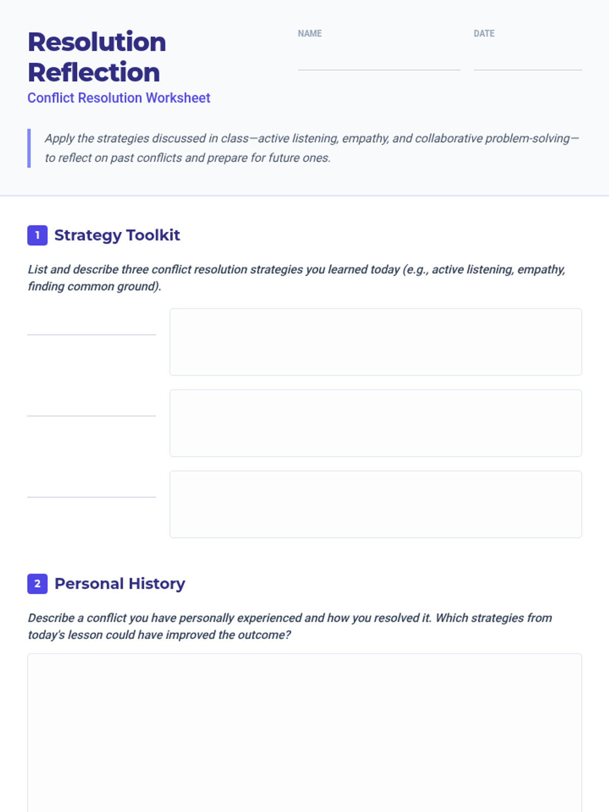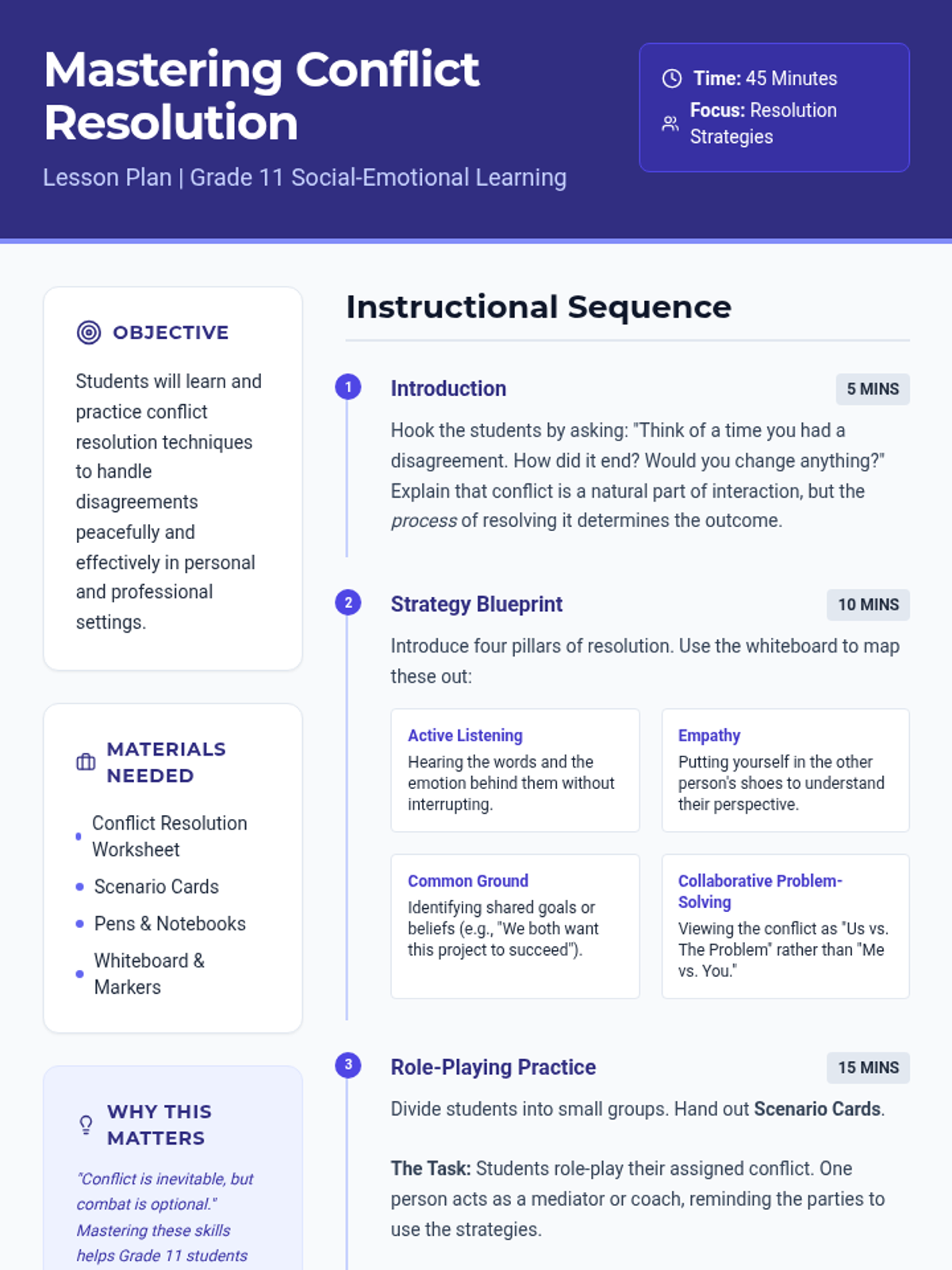 Students will learn techniques for resolving conflicts peacefully and effectively through role-playing and group discussions, focusing on communication, empathy, and problem-solving skills.