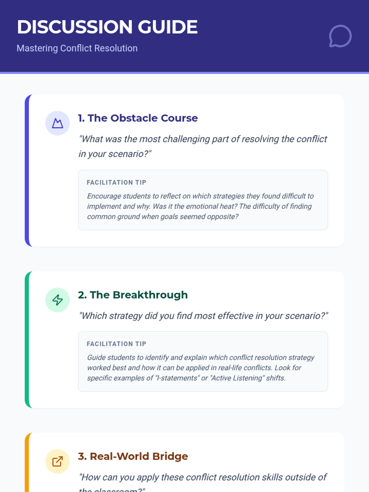 Students take turns leading a structured group check-in, applying all learned skills to manage time, ensure equity of voice, and set the tone. Afterwards, the class debriefs the effectiveness of the facilitation. This final step solidifies their role as leaders capable of maintaining group behavioral health.