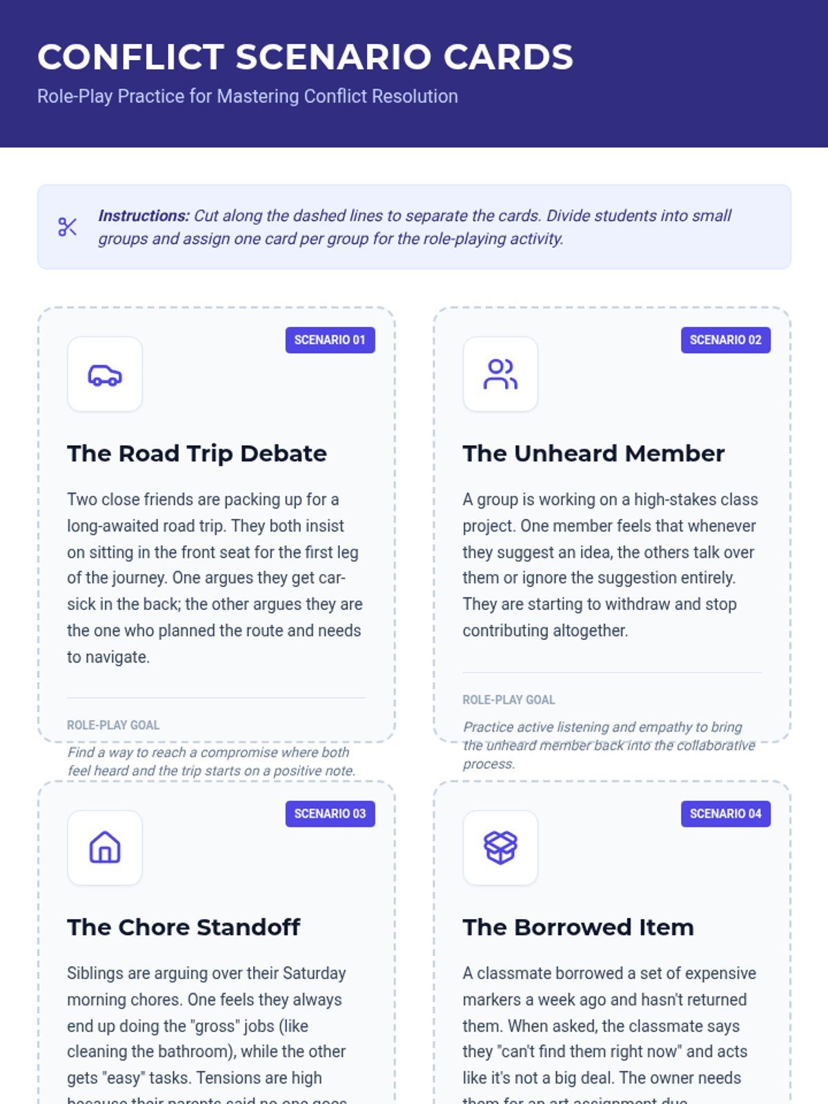 Guided practice sessions using role-play cards to simulate real-world social scenarios.