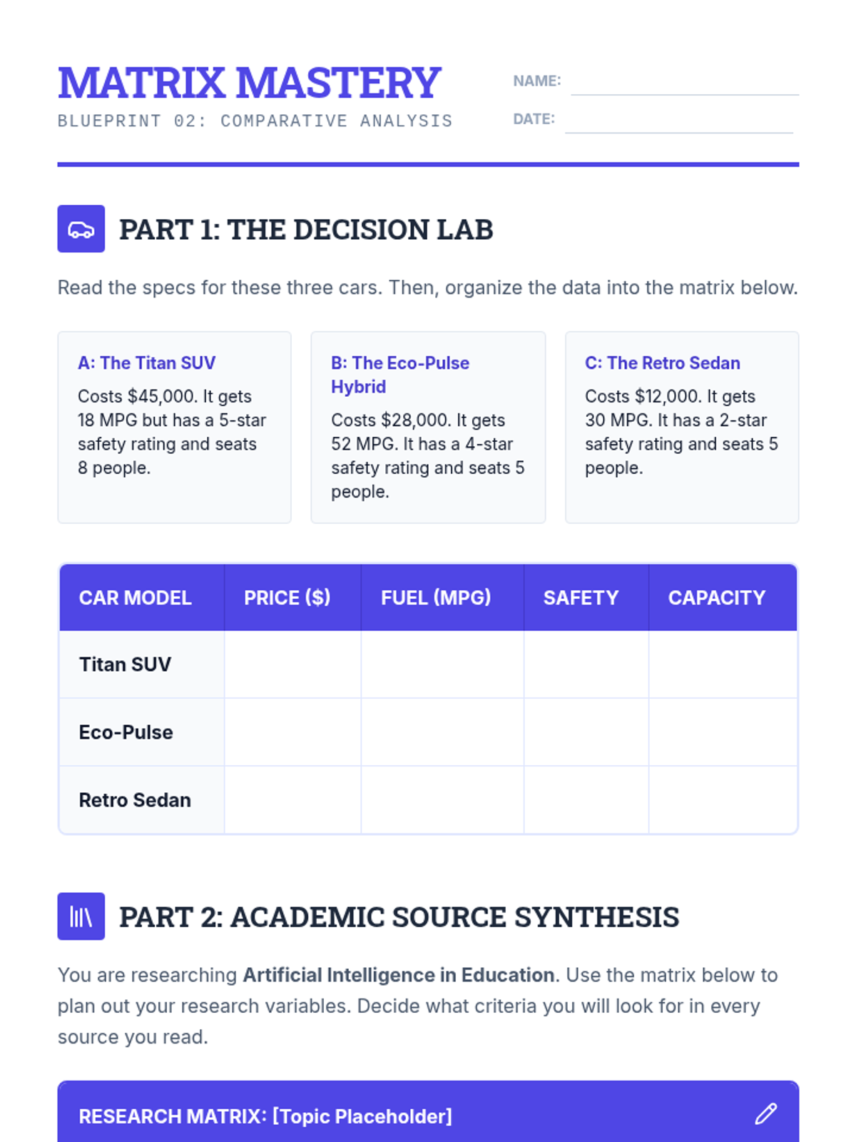 Students practice using matrix organizers to compare and contrast variables across multiple subjects or sources to facilitate lateral thinking and memory retrieval.