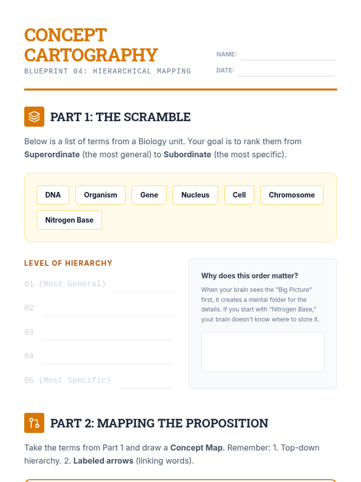 Students learn the difference between mind maps and hierarchical concept maps, focusing on linking words that explain the relationship between nodes and practicing the restructuring of linear notes into spatial formats.