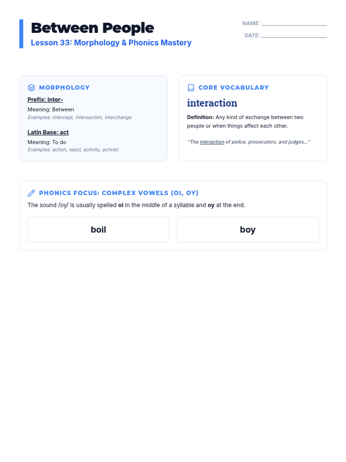 Focuses on the prefix inter- and root act, with the vocabulary word 'interaction'. Teaches diphthongs oi and oy.