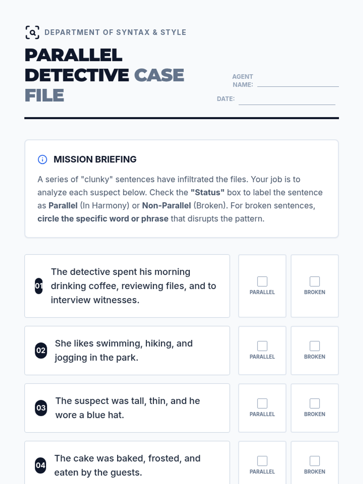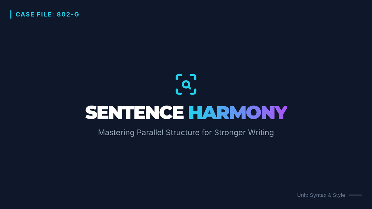 Students will learn to identify and correct parallel structure in sentences, focusing on lists of verbs, nouns, and phrases. The lesson uses a Khan Academy video to illustrate common pitfalls like mixing gerunds and infinitives or active and passive voice.