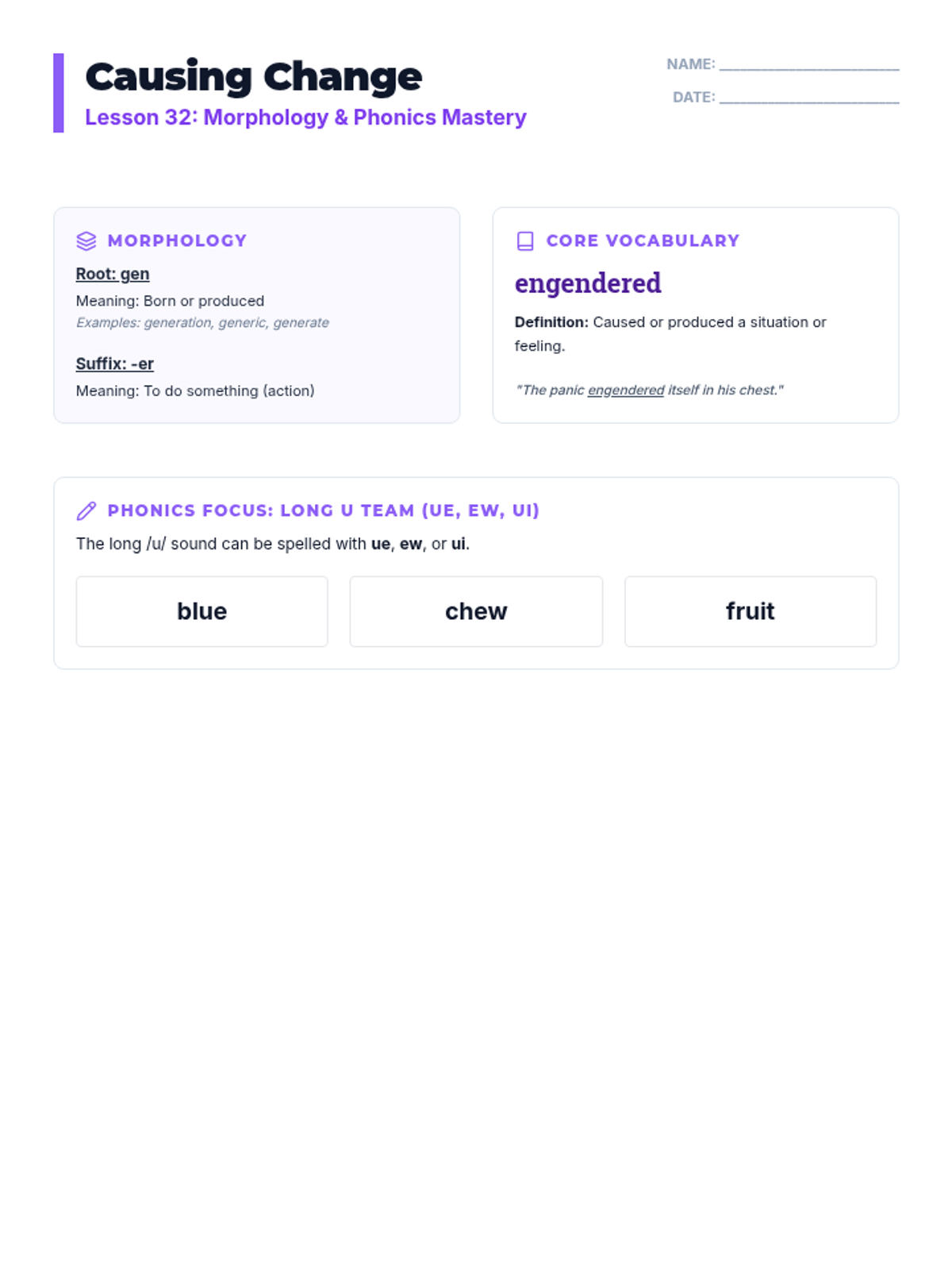 Focuses on the root gen and suffix -er, with the vocabulary word 'engendered'. Teaches Long U vowel teams (ue, ew, ui).