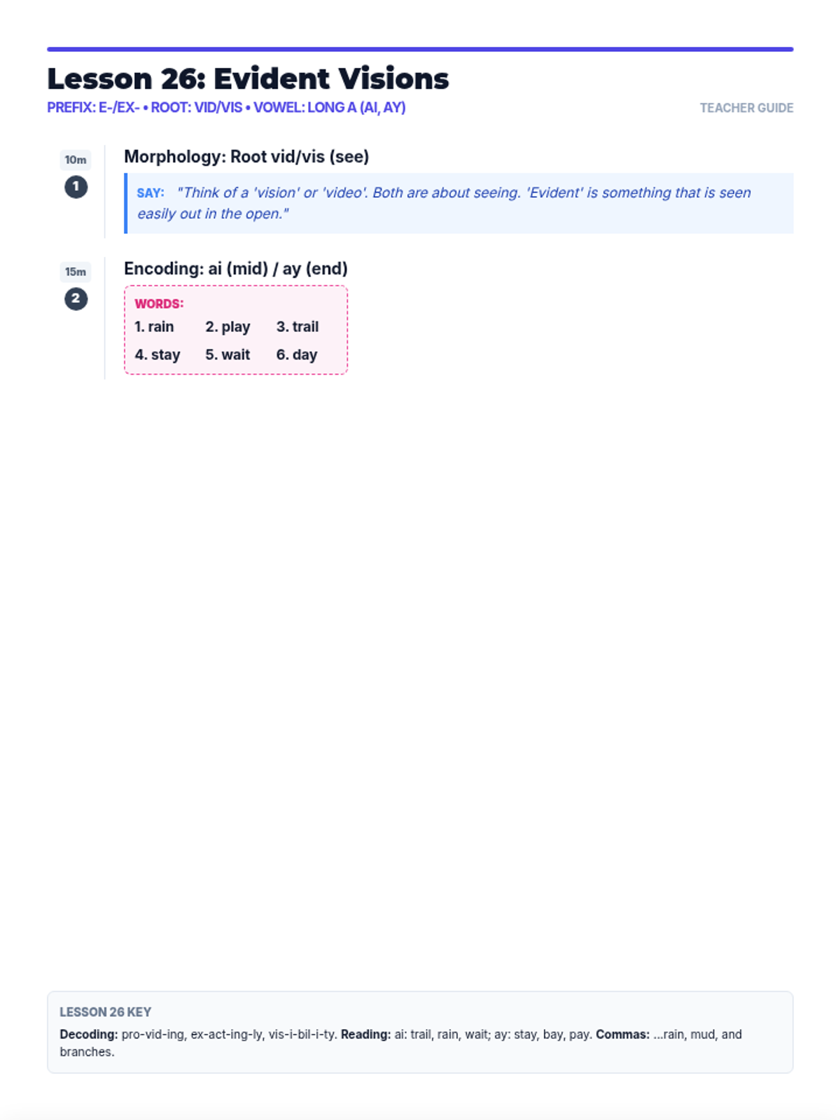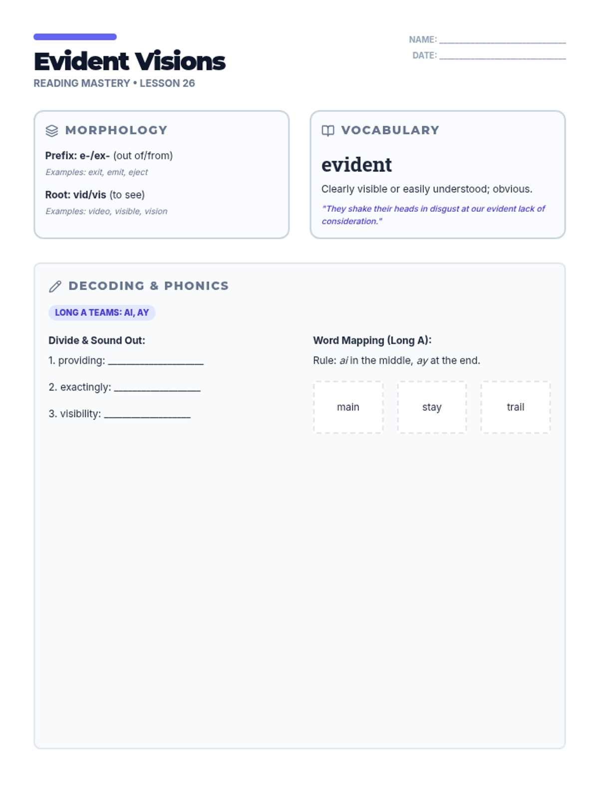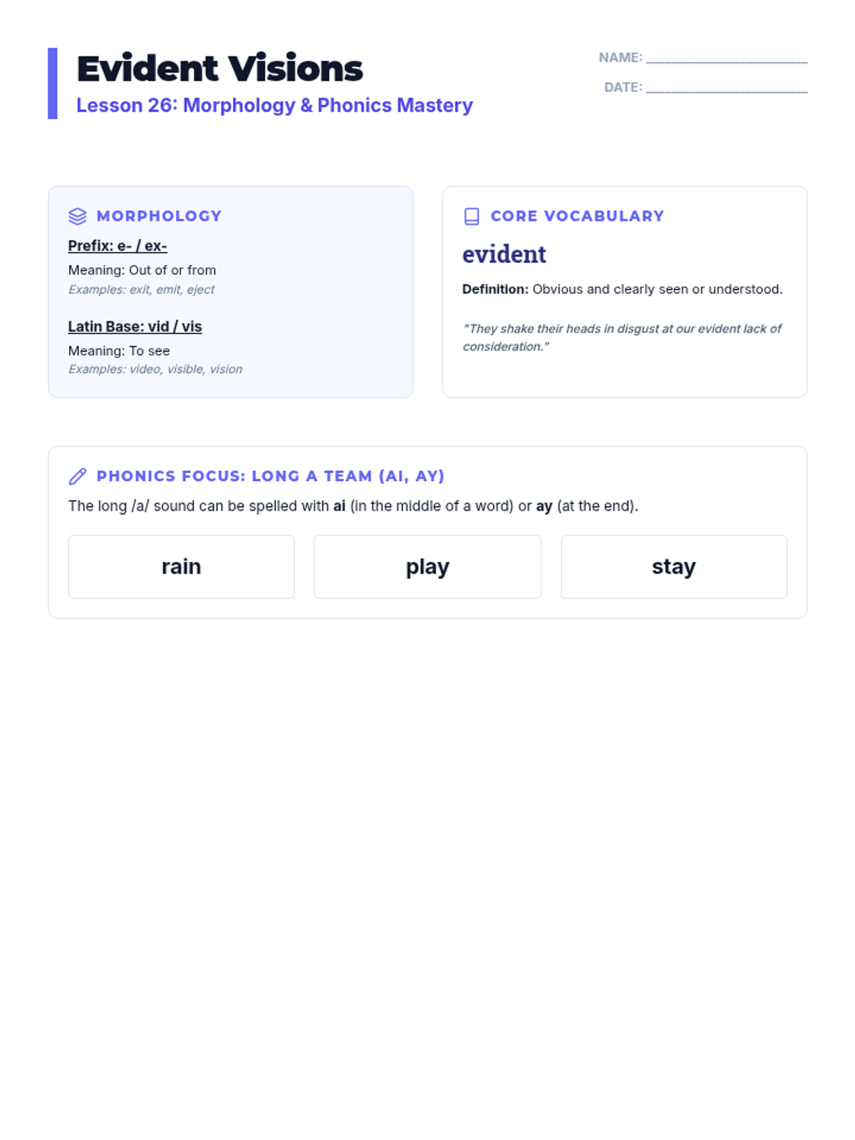 Focuses on the prefix e-/ex- and the root vid/vis, with the vocabulary word 'evident'. Teaches Long A vowel teams (ai, ay).
