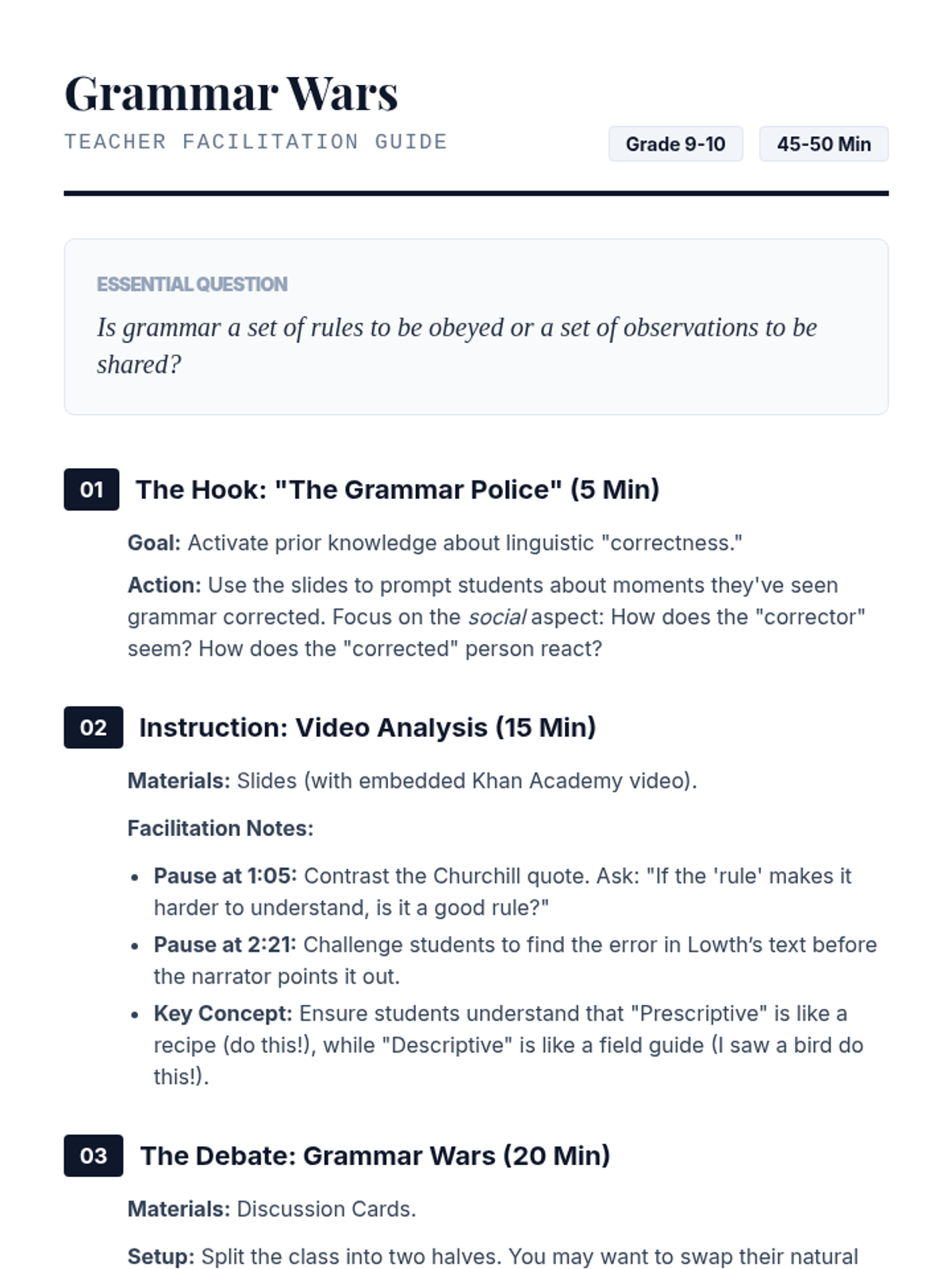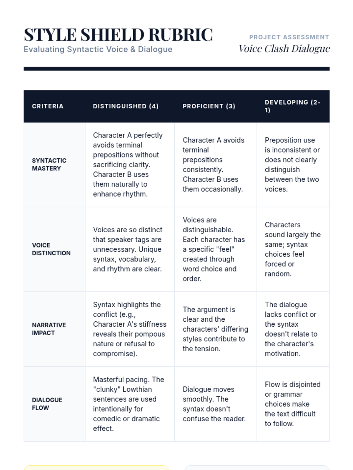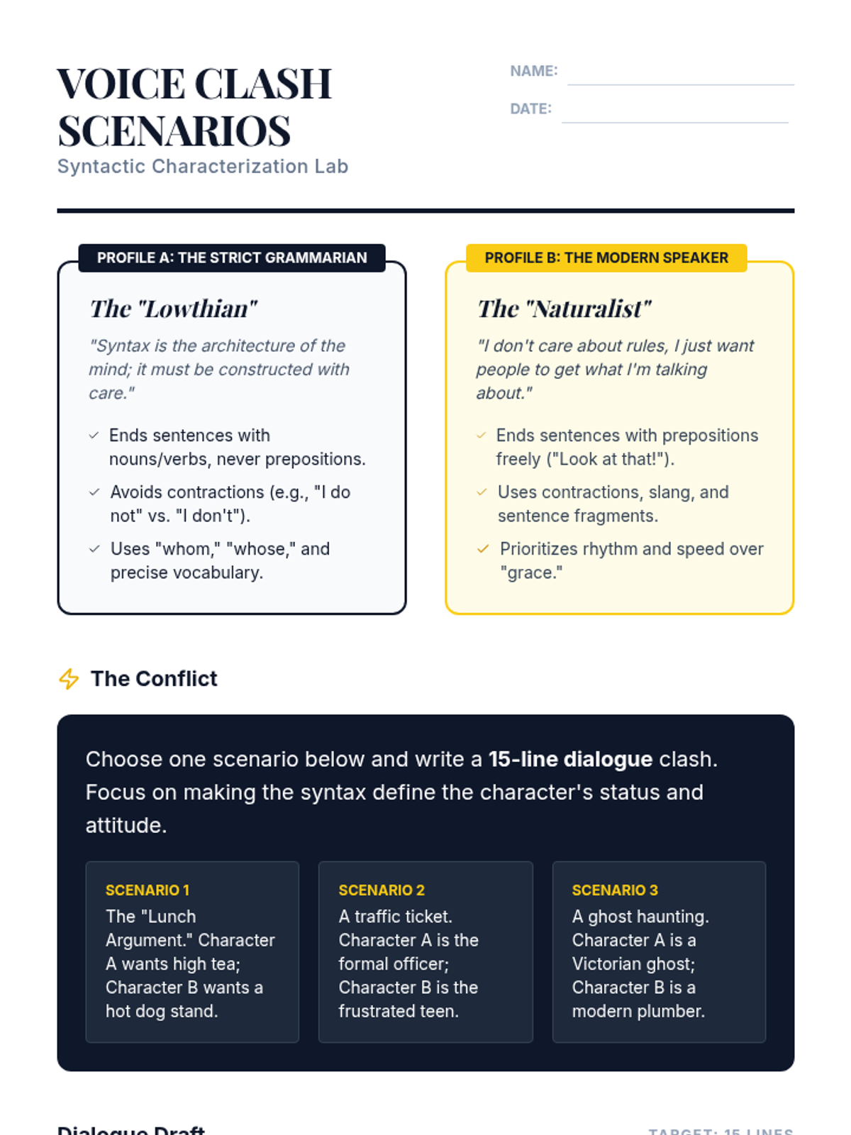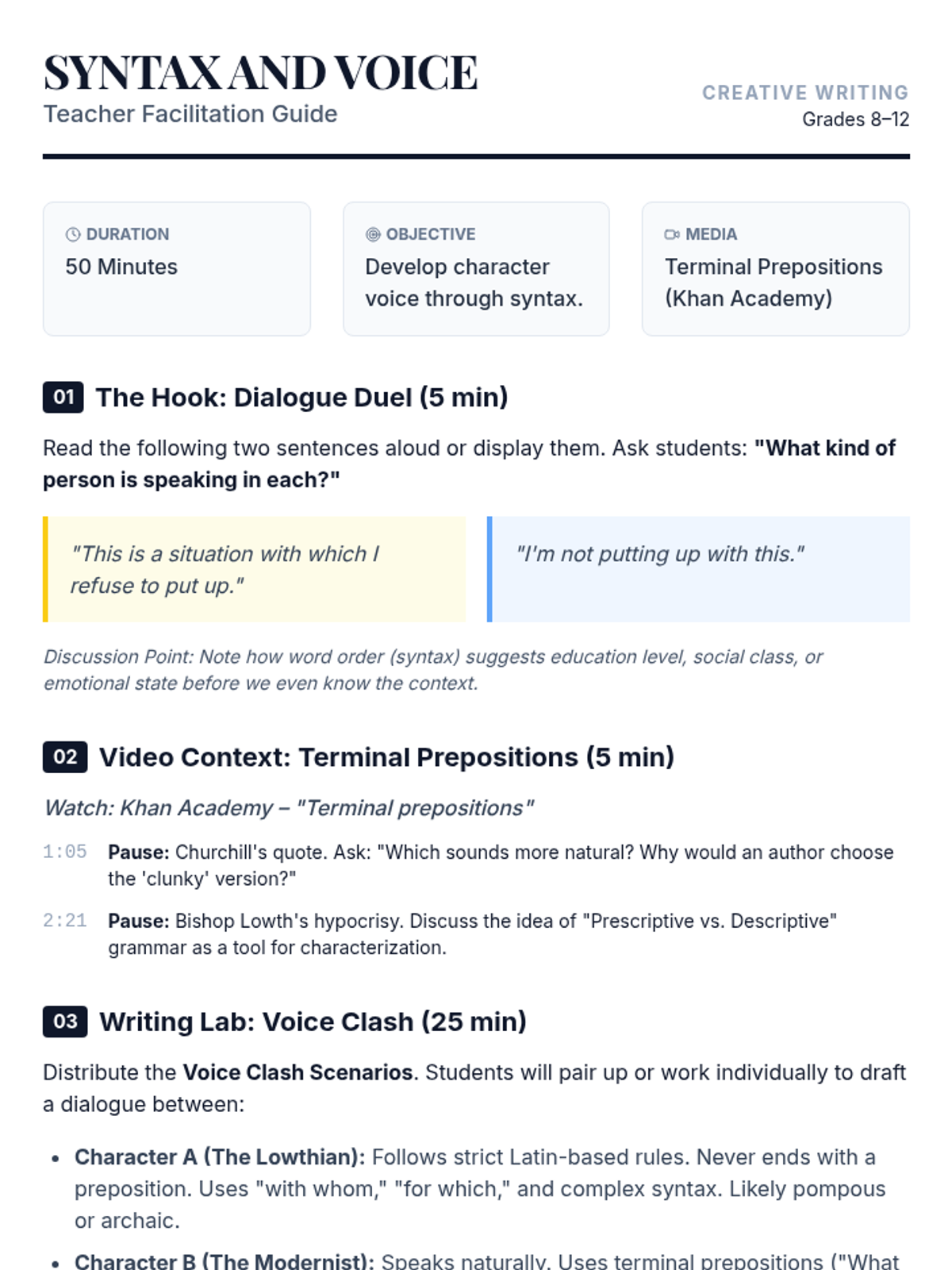 A creative writing lesson for grades 8-12 focusing on how syntax and the use (or avoidance) of terminal prepositions can define a character's voice and personality. Students contrast formal 'Lowthian' rules with natural speech through video analysis and dialogue writing.