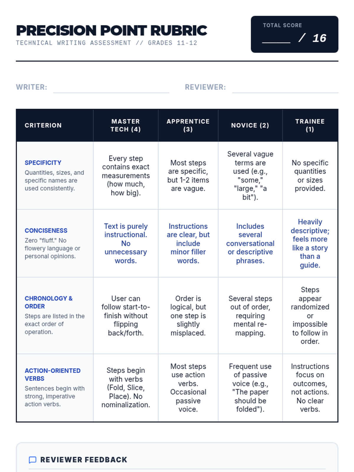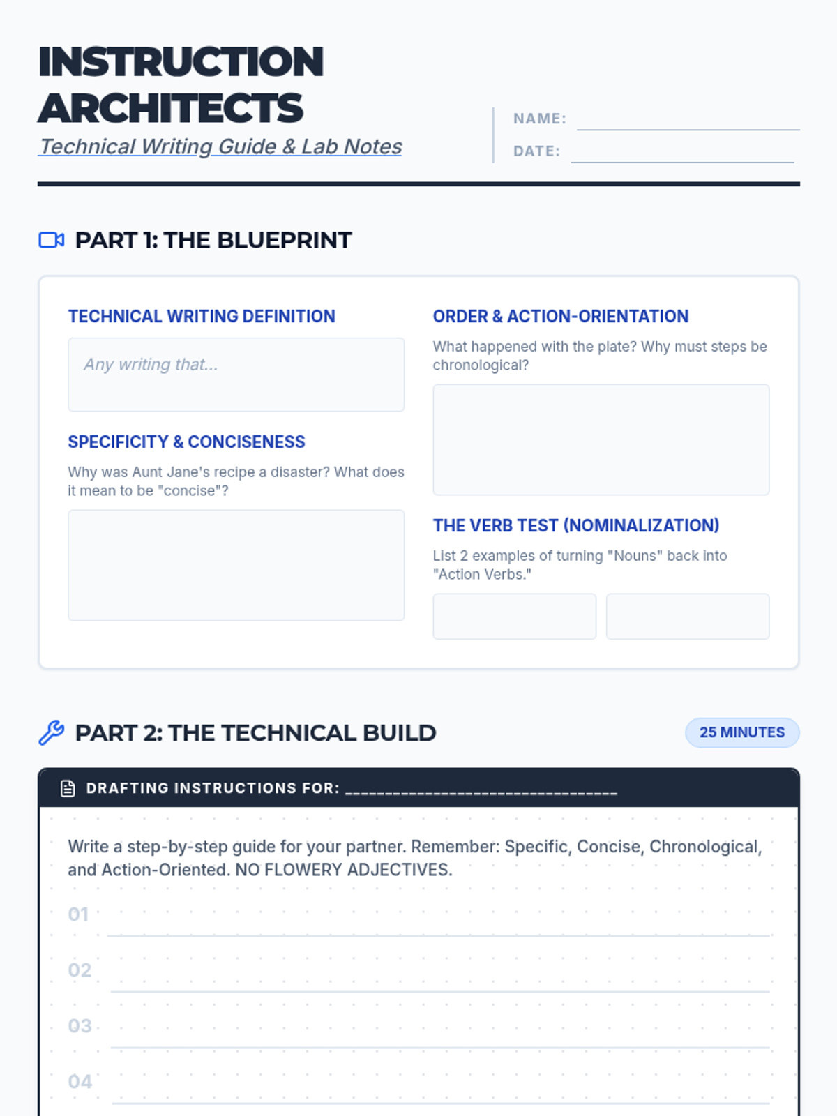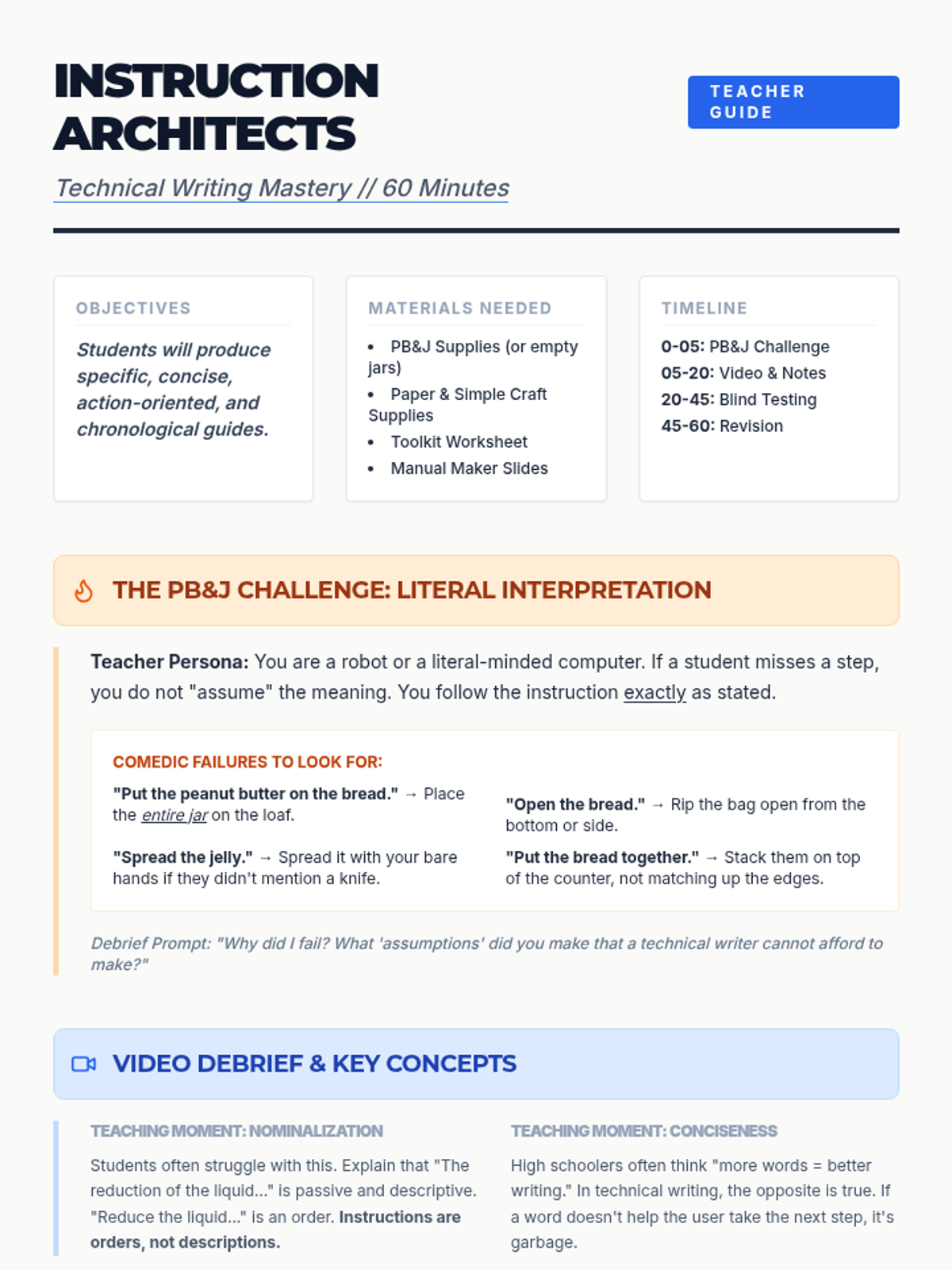 A technical writing lesson for upper high schoolers where they learn to move beyond flowery prose to create specific, action-oriented, and chronological guides through humor-filled video analysis and a 'Blind User' testing activity.