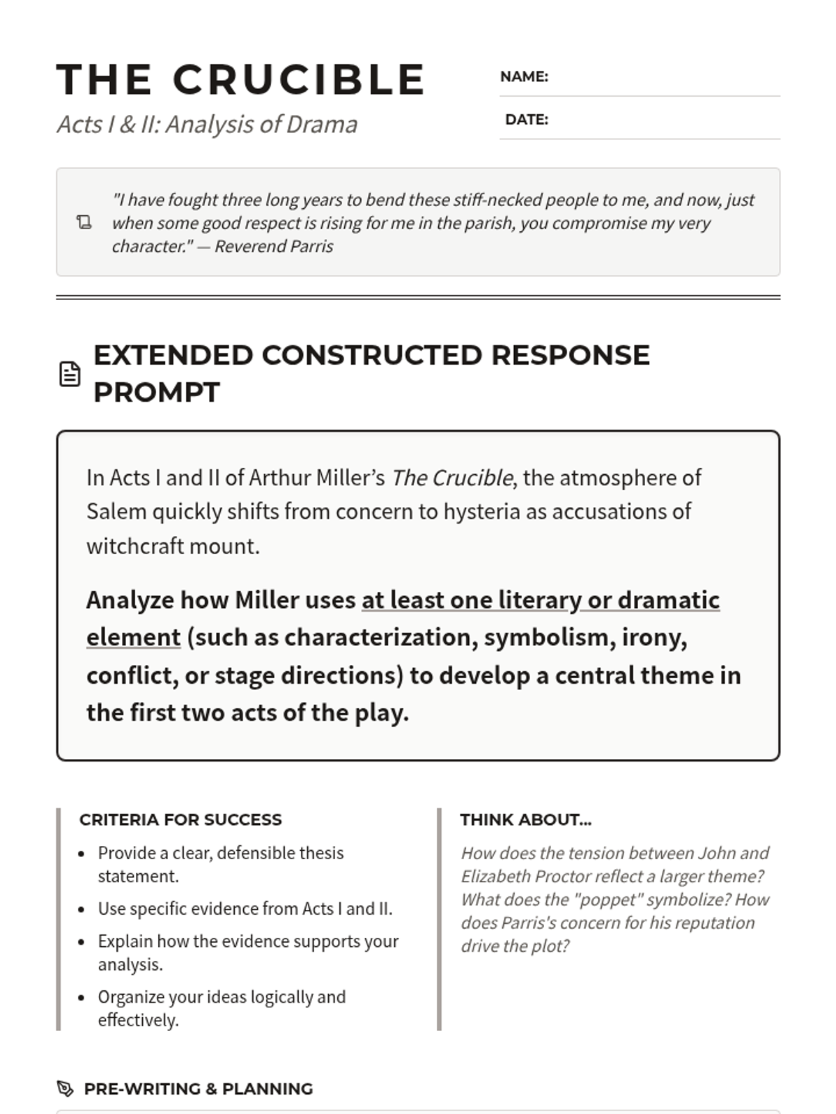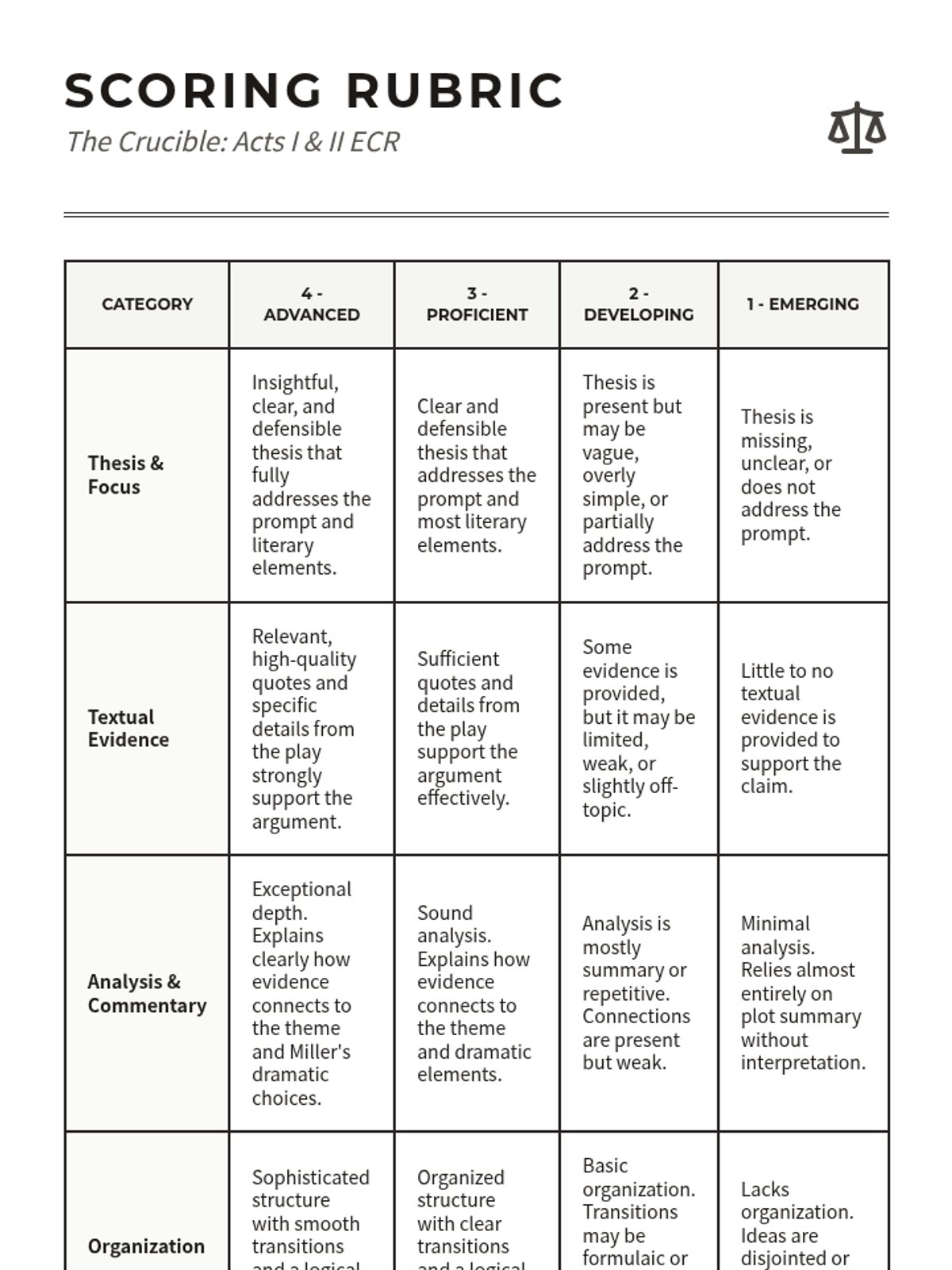 A focused lesson providing an Extended Constructed Response (ECR) essay prompt and a comprehensive scoring rubric for Acts I and II of Arthur Miller's *The Crucible*. Students will analyze how dramatic elements contribute to the play's developing themes.