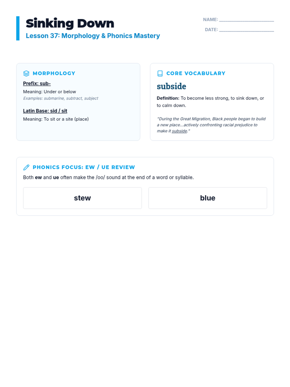 Focuses on the prefix sub- and root sid/sit, with the vocabulary word 'subside'. Teaches diphthongs ew and ue review.