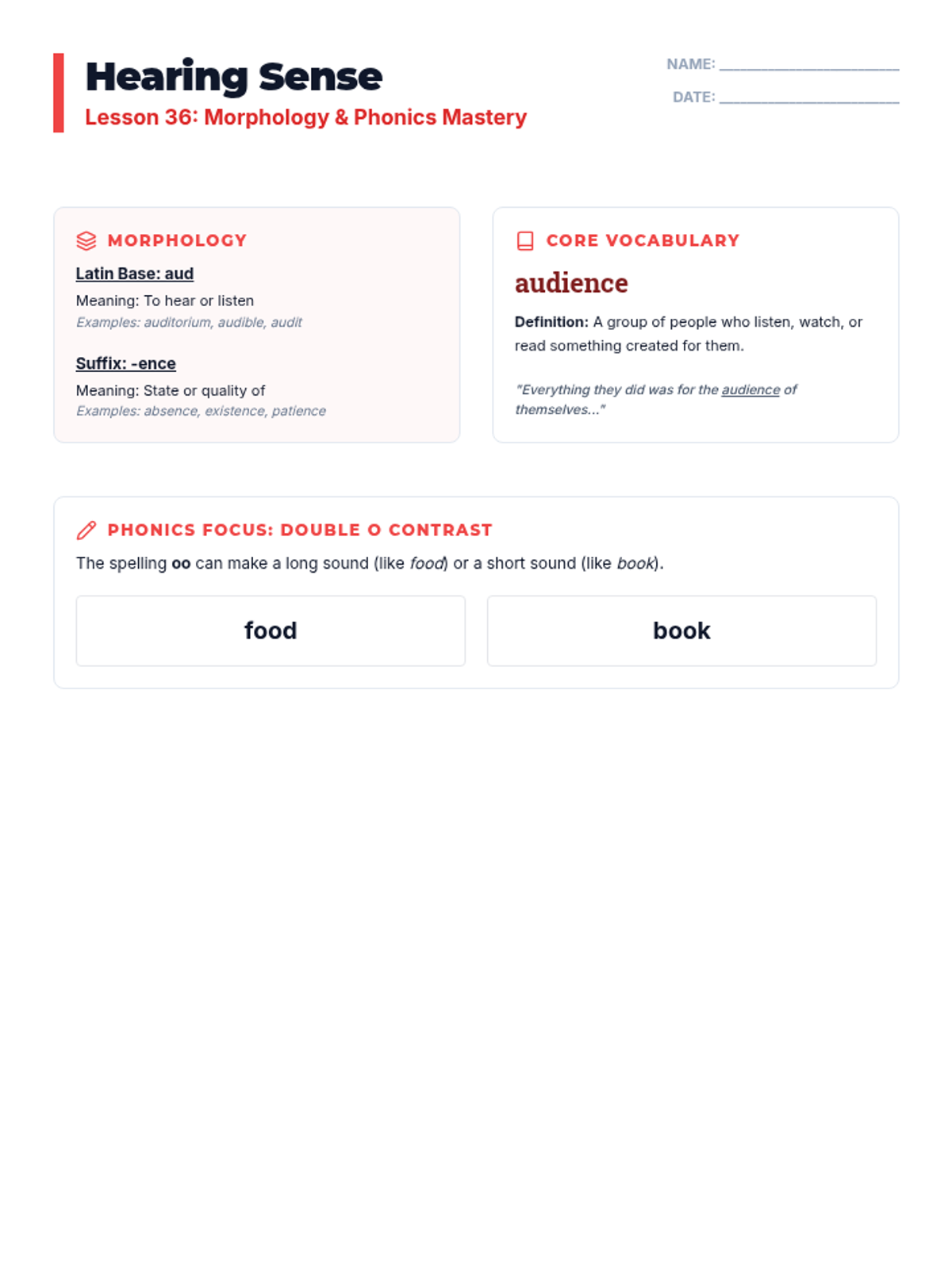Focuses on the root aud and suffix -ence, with the vocabulary word 'audience'. Teaches the diphthong oo (food vs book).