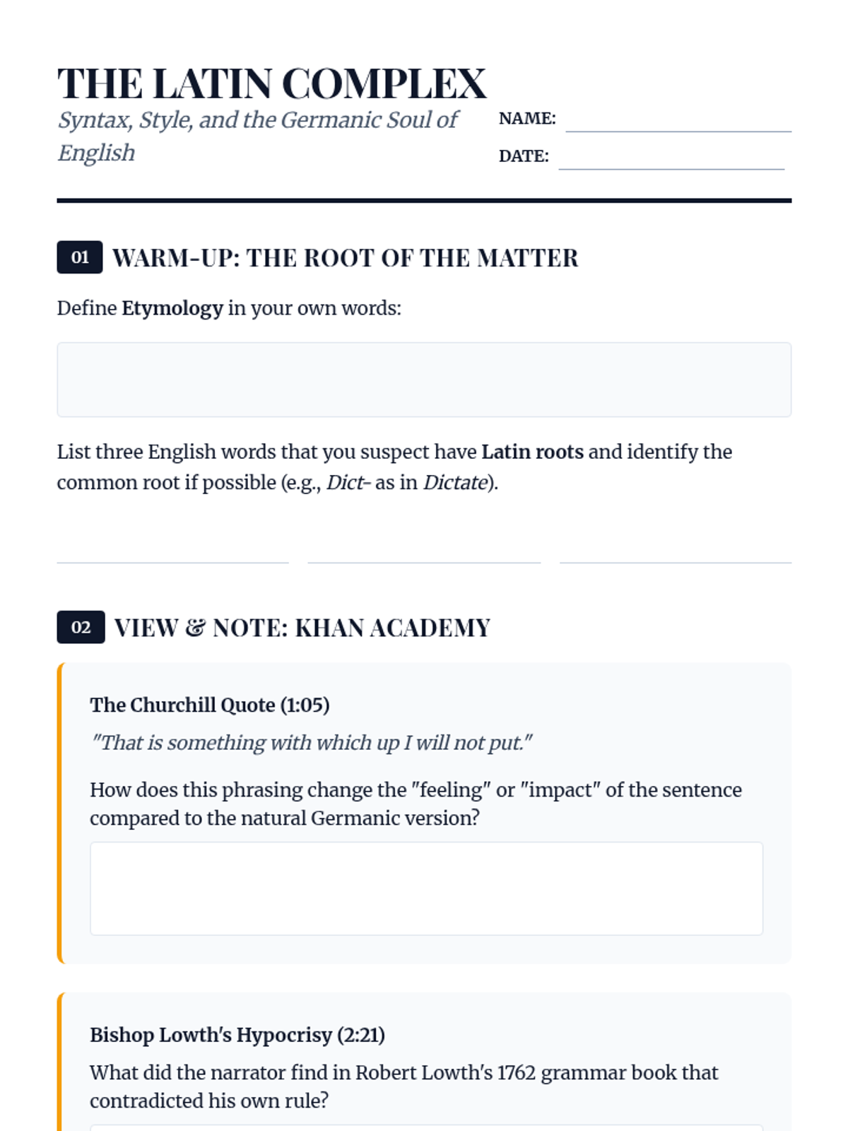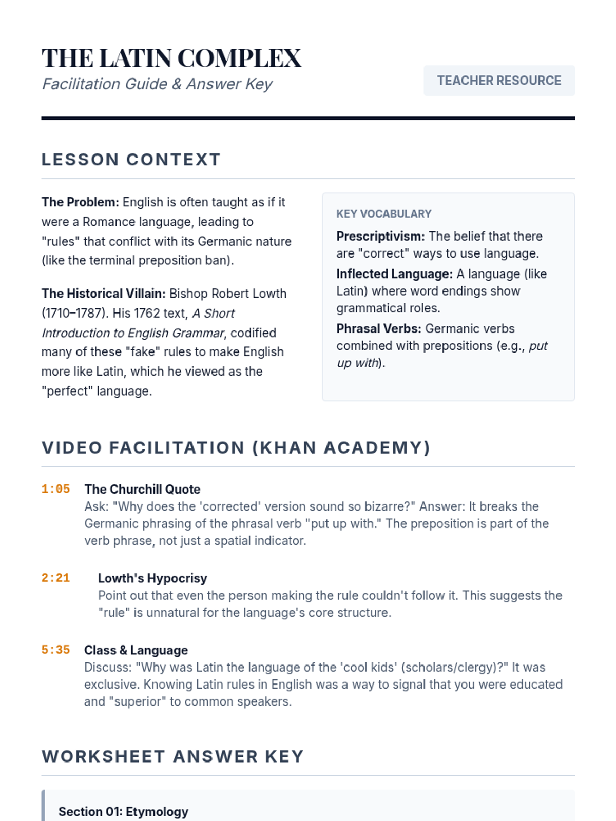 This lesson explores the historical reasons why English grammar rules often mirror Latin, focusing on the 18th-century "inferiority complex" that led scholars to impose Latinate structures on a Germanic language. Students will analyze the "terminal preposition" myth and practice identifying Germanic versus Romance stylistic choices.