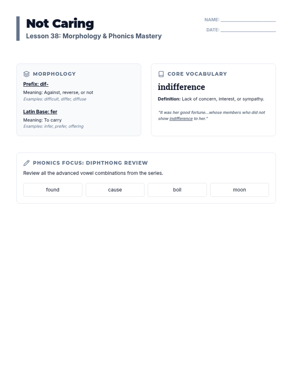 Focuses on the prefix dif- and root fer, with the vocabulary word 'indifference'. Teaches synthesis of complex vowel patterns.
