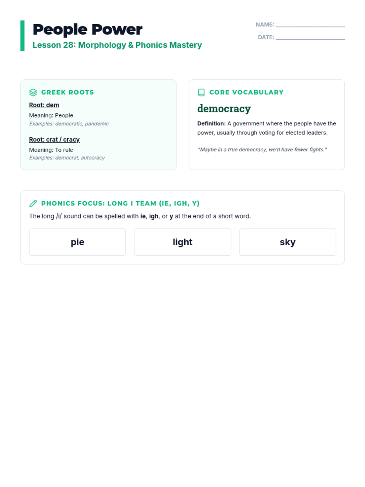 Focuses on the roots dem and crat/cracy, with the vocabulary word 'democracy'. Teaches Long I vowel teams (ie, igh, y).