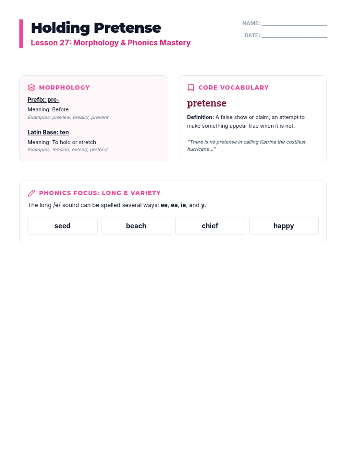 Focuses on the prefix pre- and the root ten, with the vocabulary word 'pretense'. Teaches Long E vowel teams (ee, ea, ie, y).