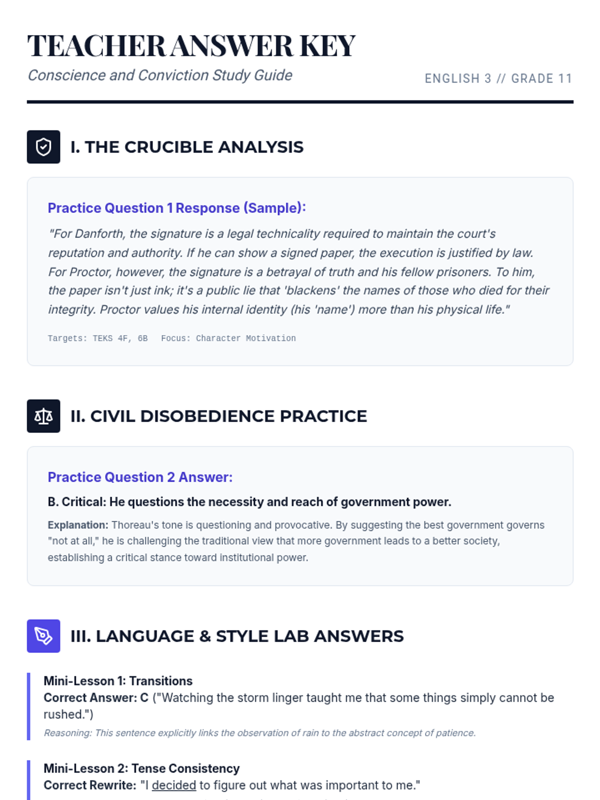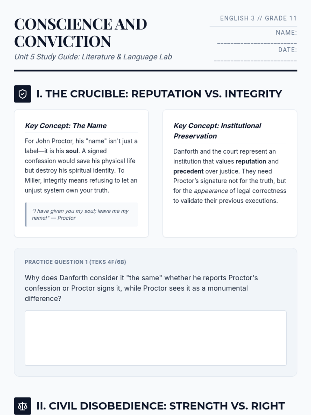 A comprehensive study guide and review lesson covering the intersection of individual conscience and societal law through Arthur Miller's 'The Crucible' and Henry David Thoreau's 'Civil Disobedience', including targeted language and style mini-lessons.