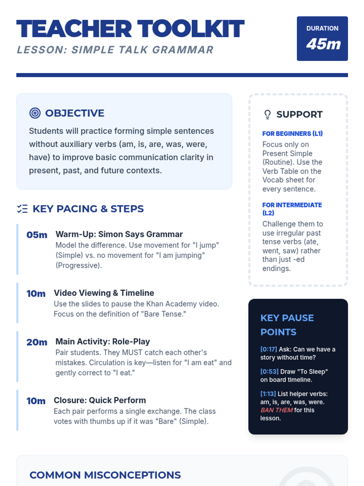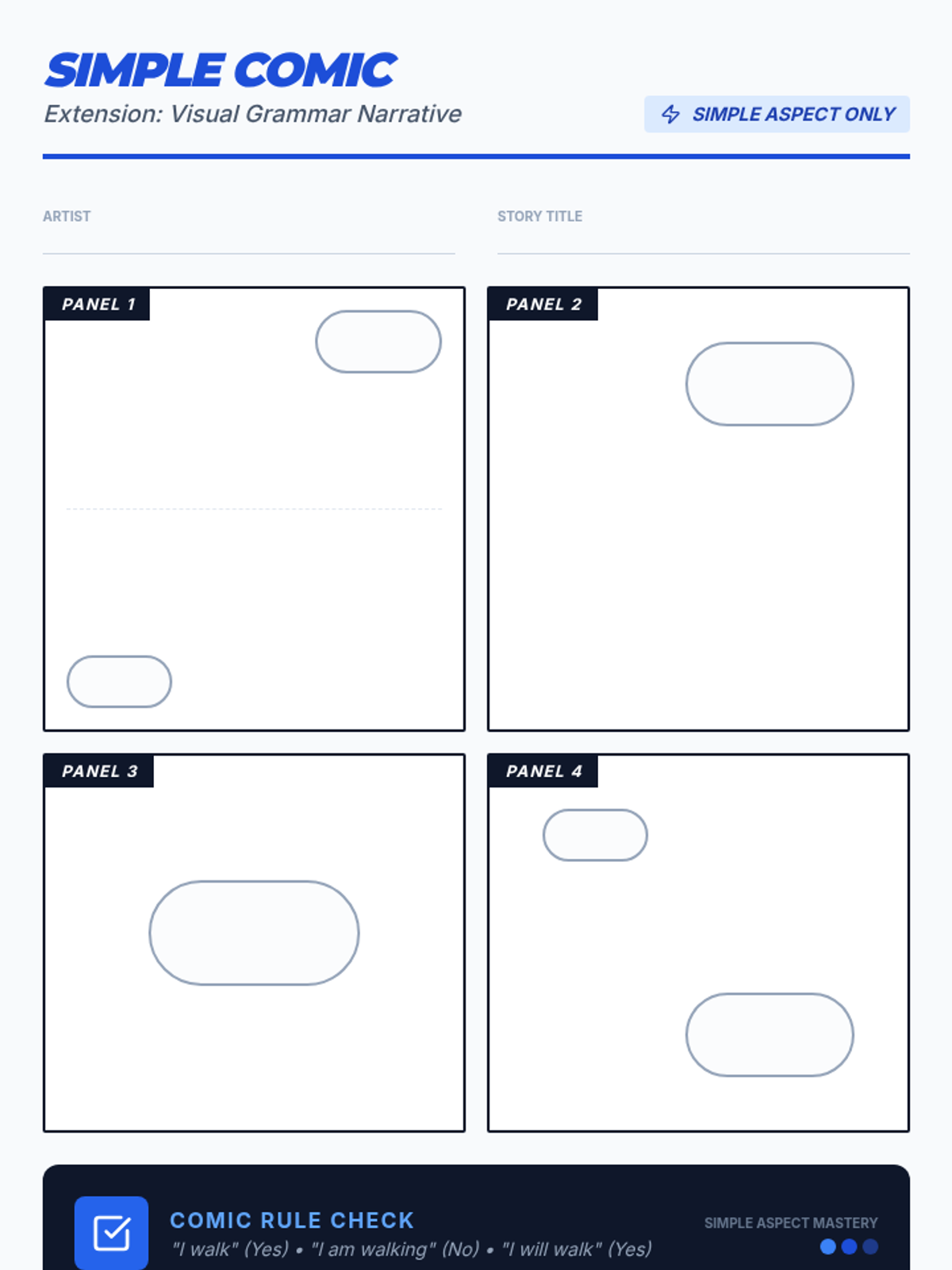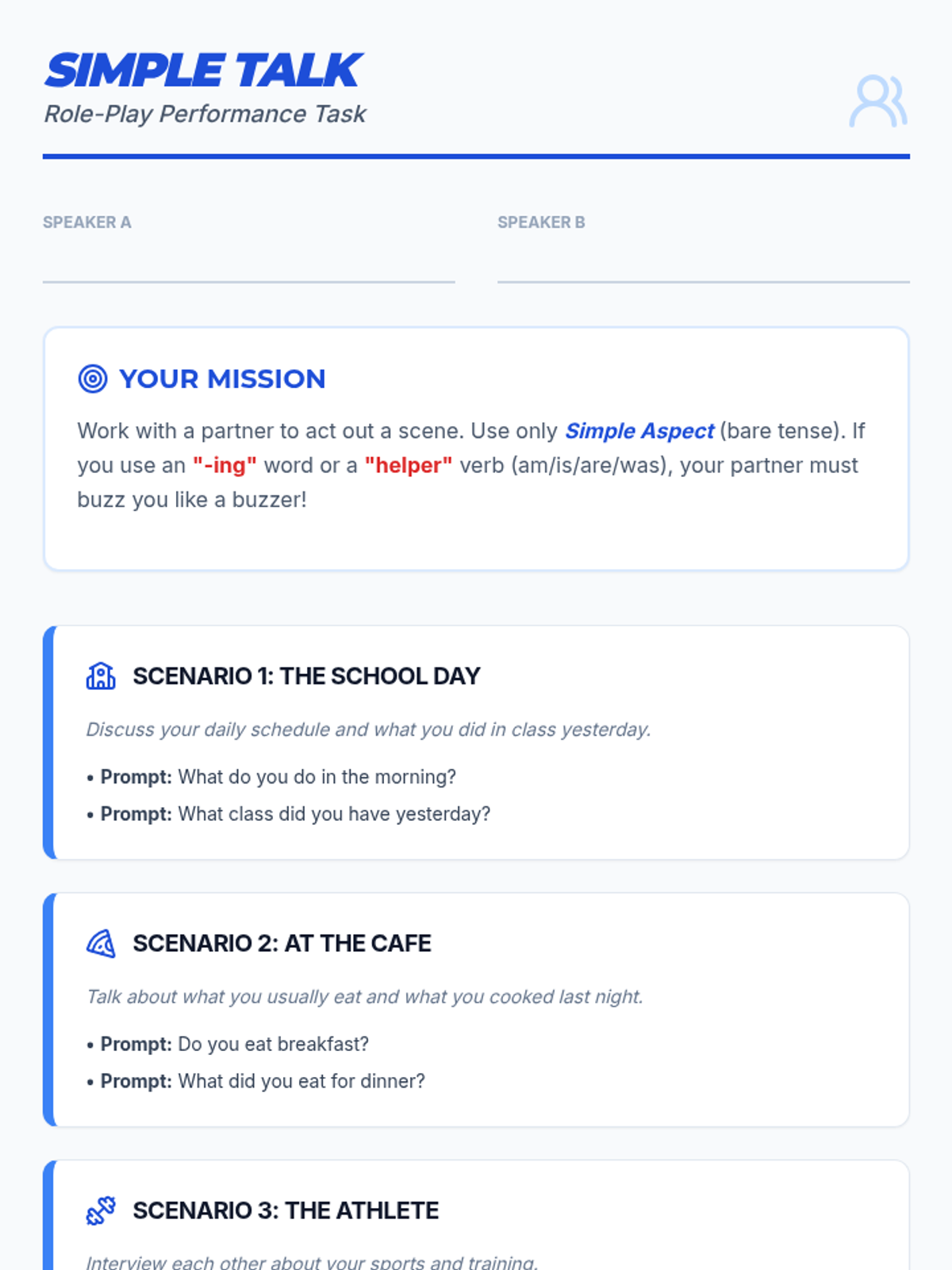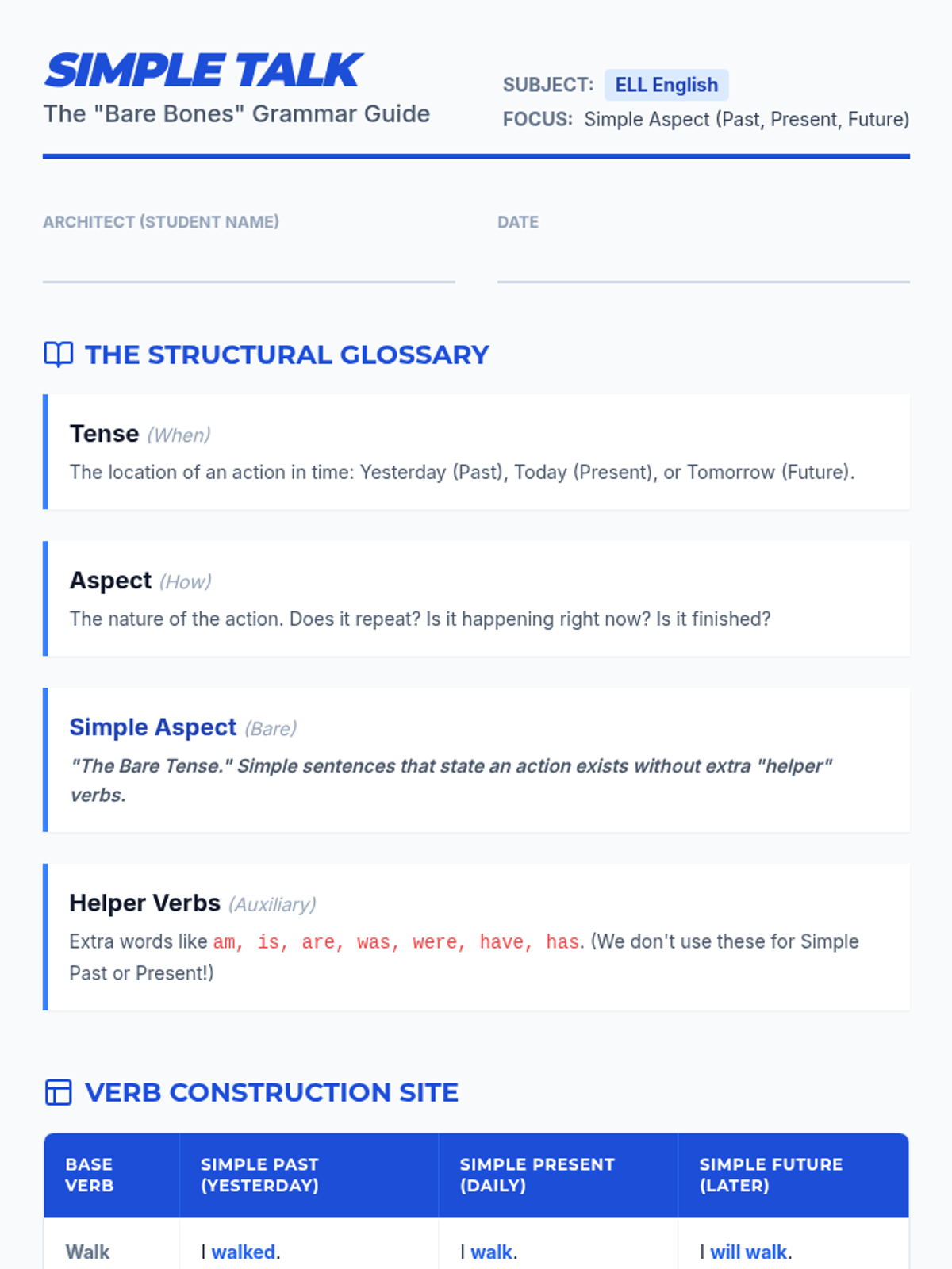 A foundational grammar lesson for Middle/High School ELLs focusing on the Simple Aspect (Present, Past, and Future) to improve communication clarity by eliminating unnecessary auxiliary verbs.