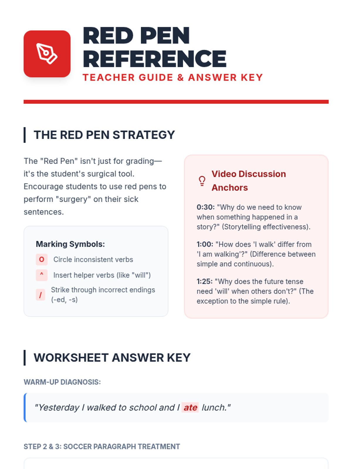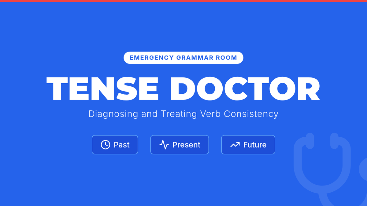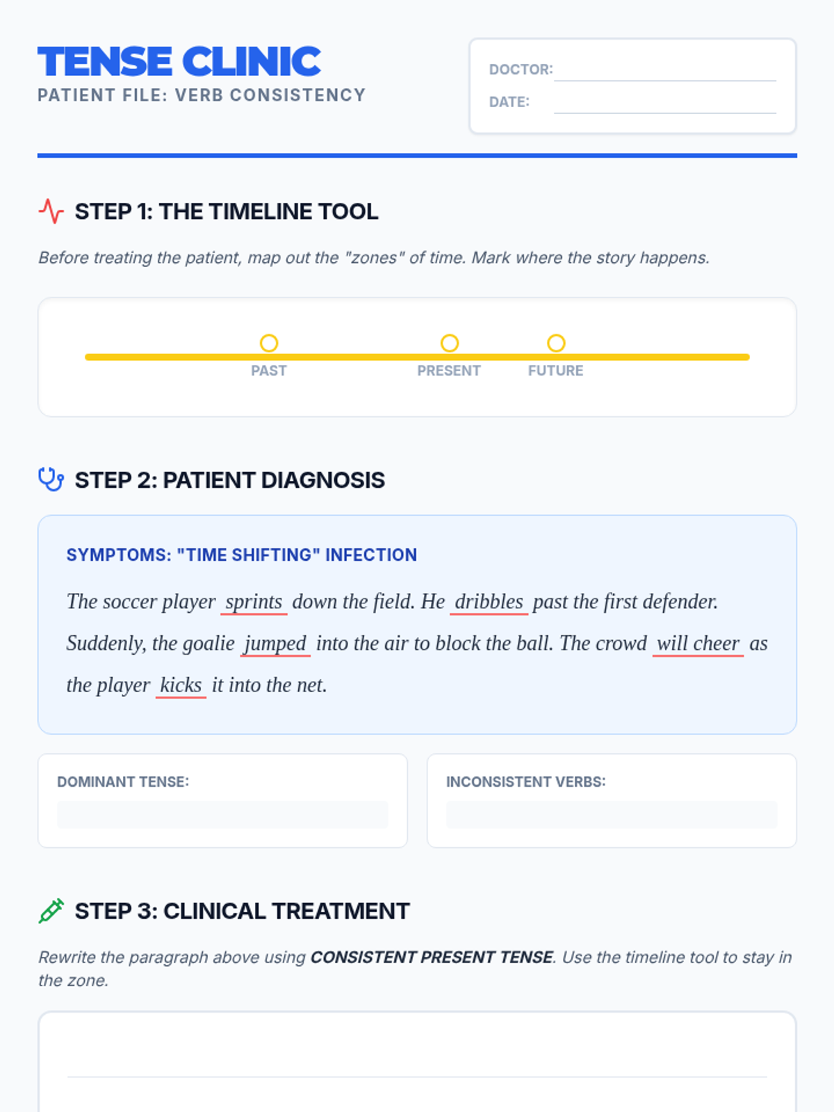 A remedial lesson for middle and high school students focused on recognizing and correcting verb tense inconsistencies using the 'Simple Aspect' timeline strategy. Students act as 'Tense Doctors' to diagnose and treat sick sentences.