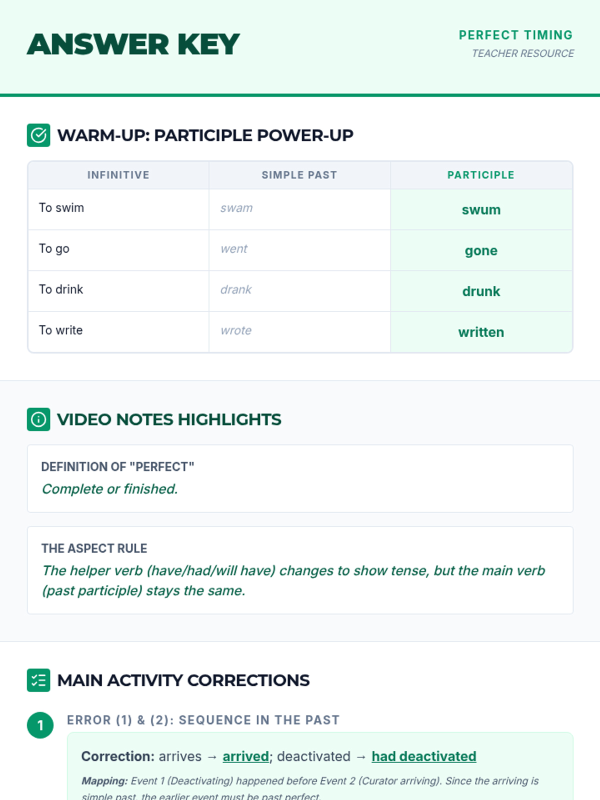 A comprehensive 30-45 minute lesson on the past perfect tense, featuring explicit instructions, a time-travel themed worksheet, and a detailed teacher guide. This lesson helps students understand how to sequence two past events using the 'past before the past' structure.