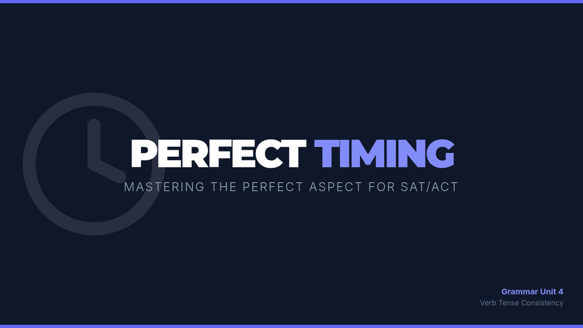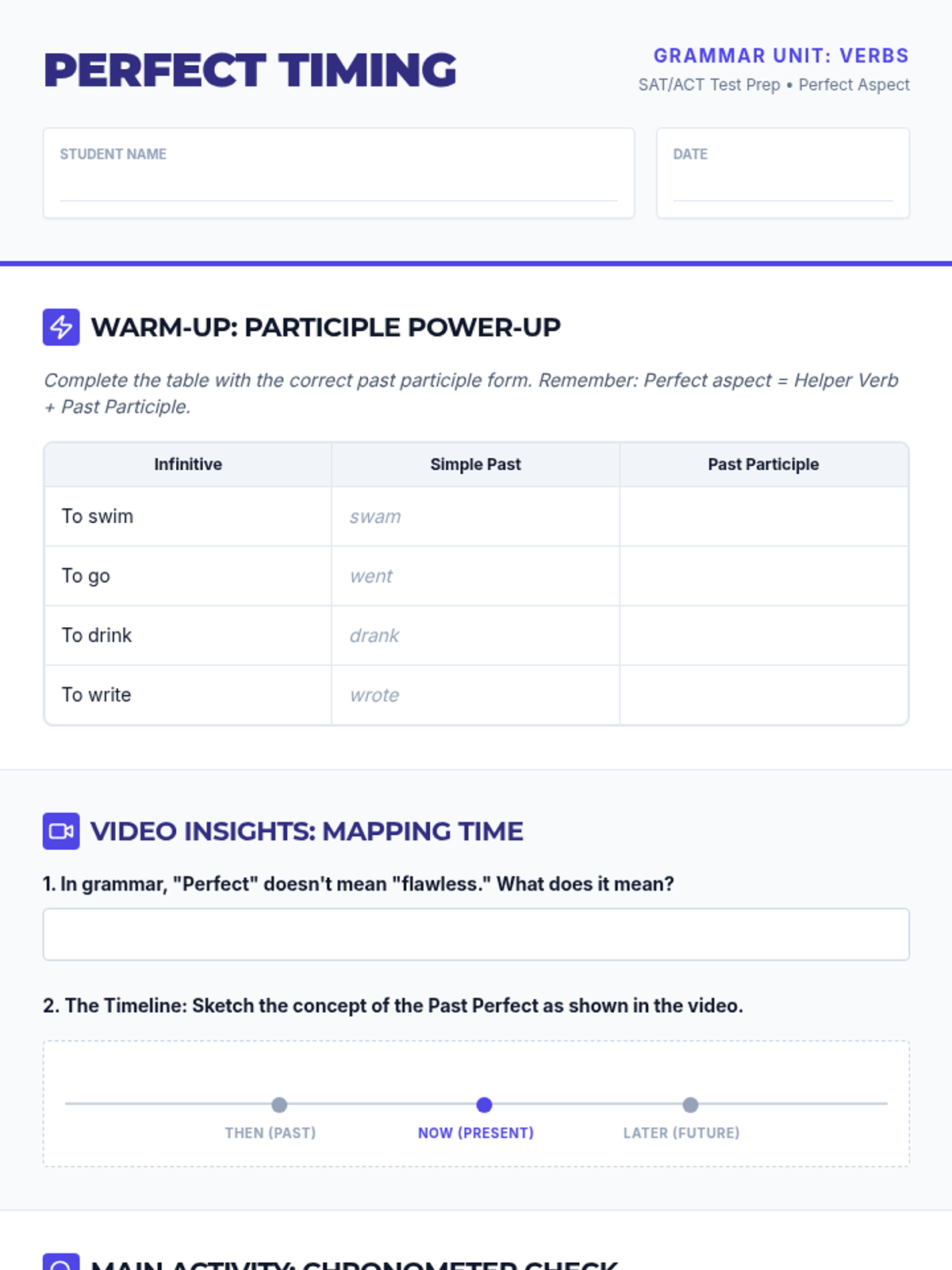 A high school SAT/ACT test prep lesson focusing on identifying and correcting verb tense consistency errors using the perfect aspect. Students will use timelines to visualize sequences of events and master the "before-past" structure essential for standardized testing.