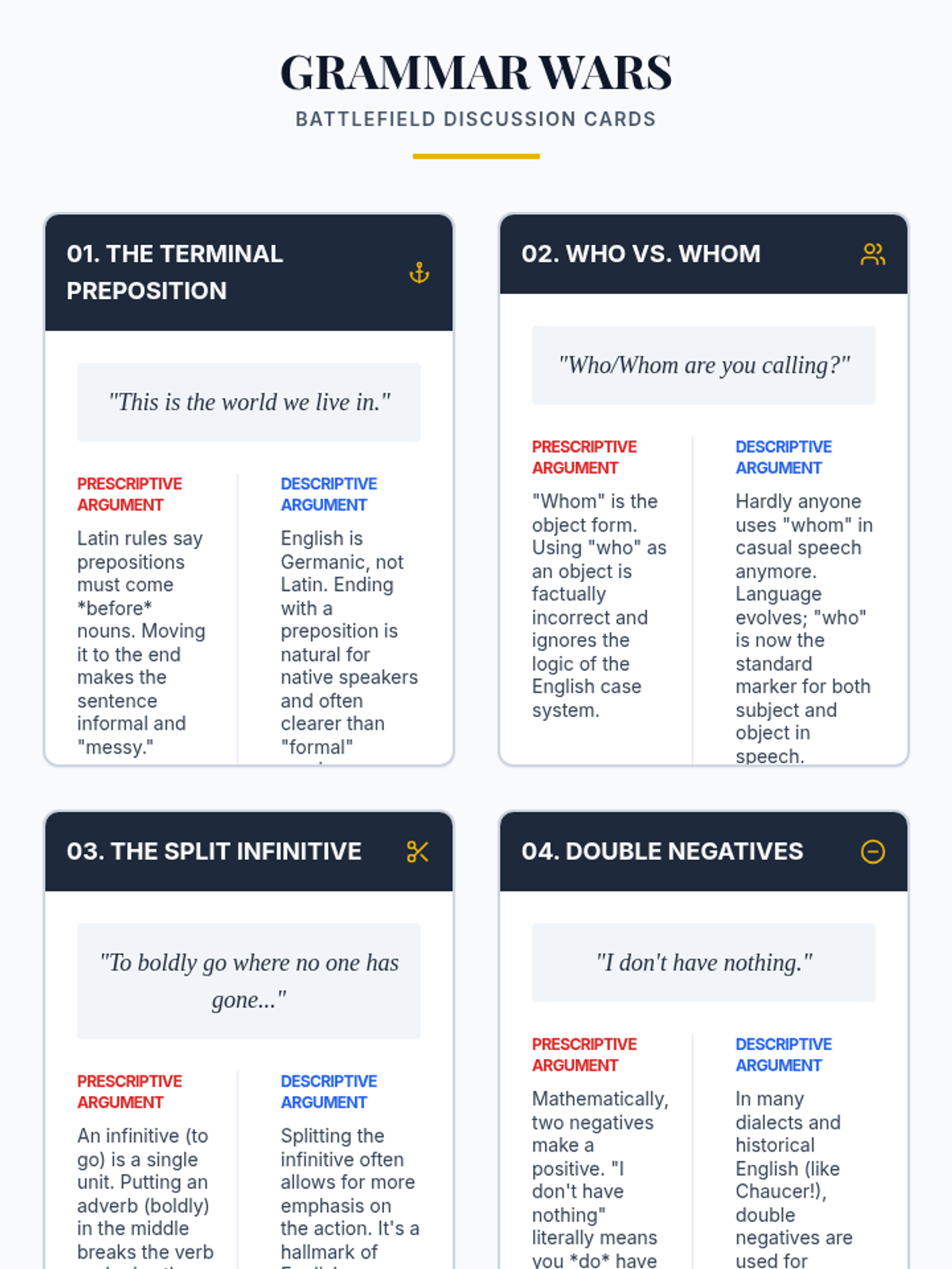A high school English lesson exploring the conflict between prescriptive and descriptive grammar, using terminal prepositions as a case study to discuss language history and usage.