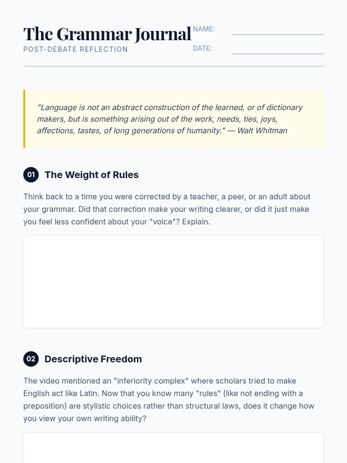 A culminating Socratic seminar focusing on the ethics of grammar. Students debate whether the use of passive voice in objective fields like journalism and history constitutes a moral failure of transparency.