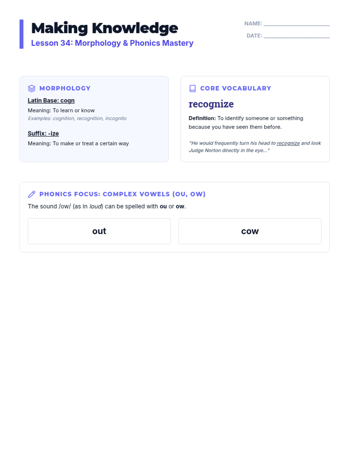 Focuses on the root cogn and suffix -ize, with the vocabulary word 'recognize'. Teaches diphthongs ou and ow.