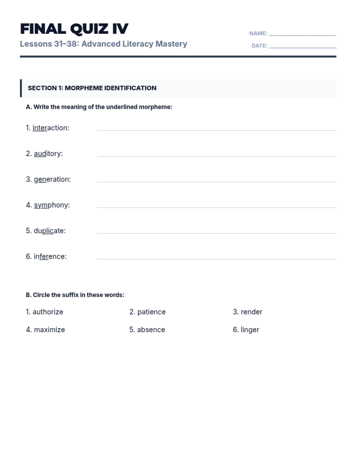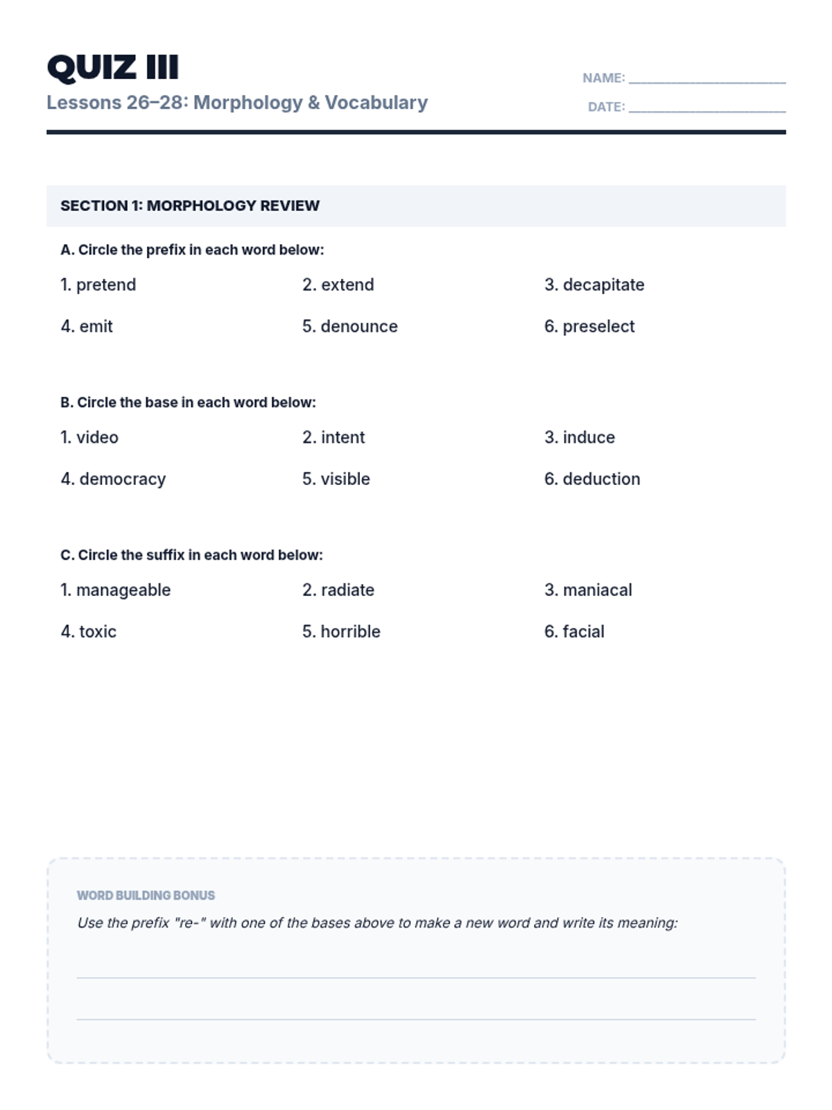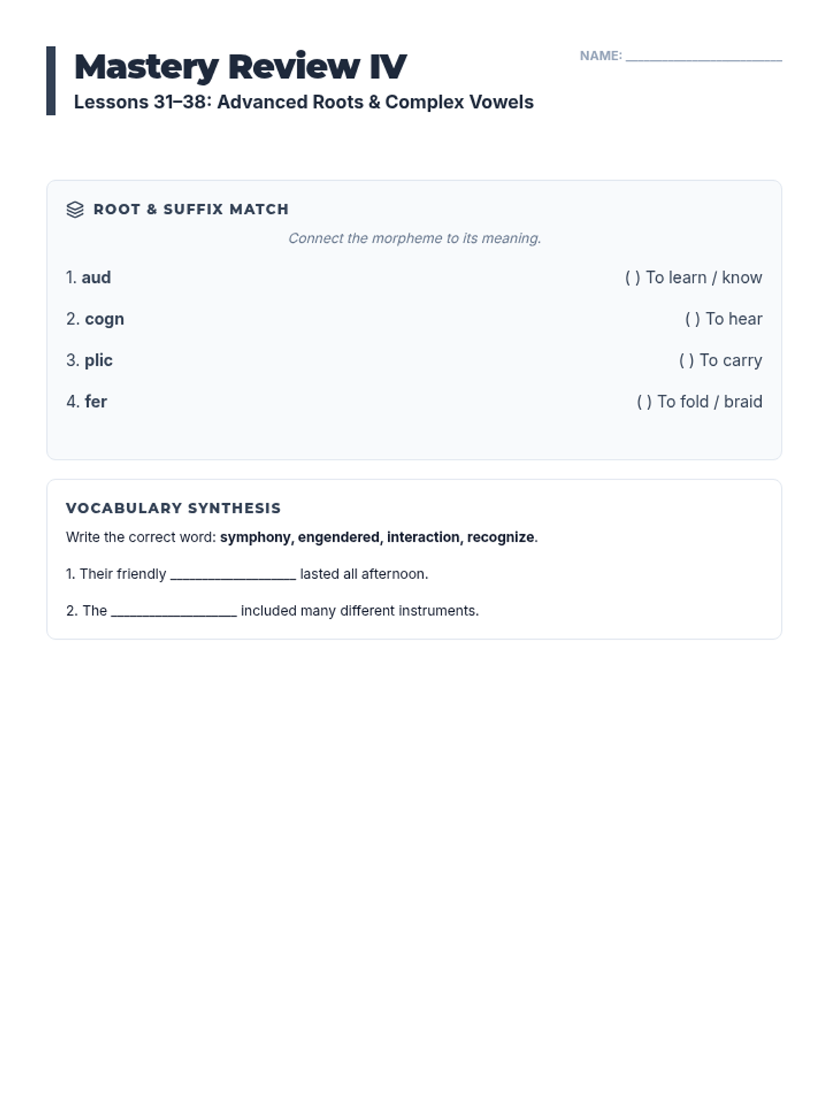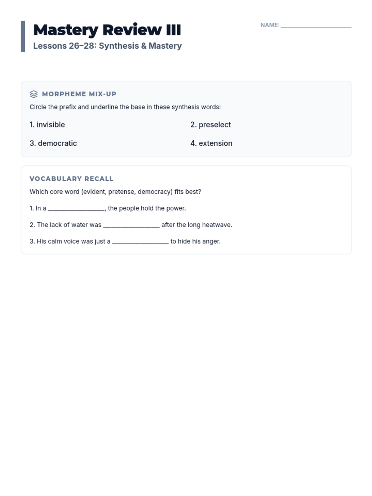 A comprehensive cumulative review of phonics, morphology, vocabulary, and grammar skills taught in Lessons 1-18. Focuses on mechanical mastery and academic readiness.