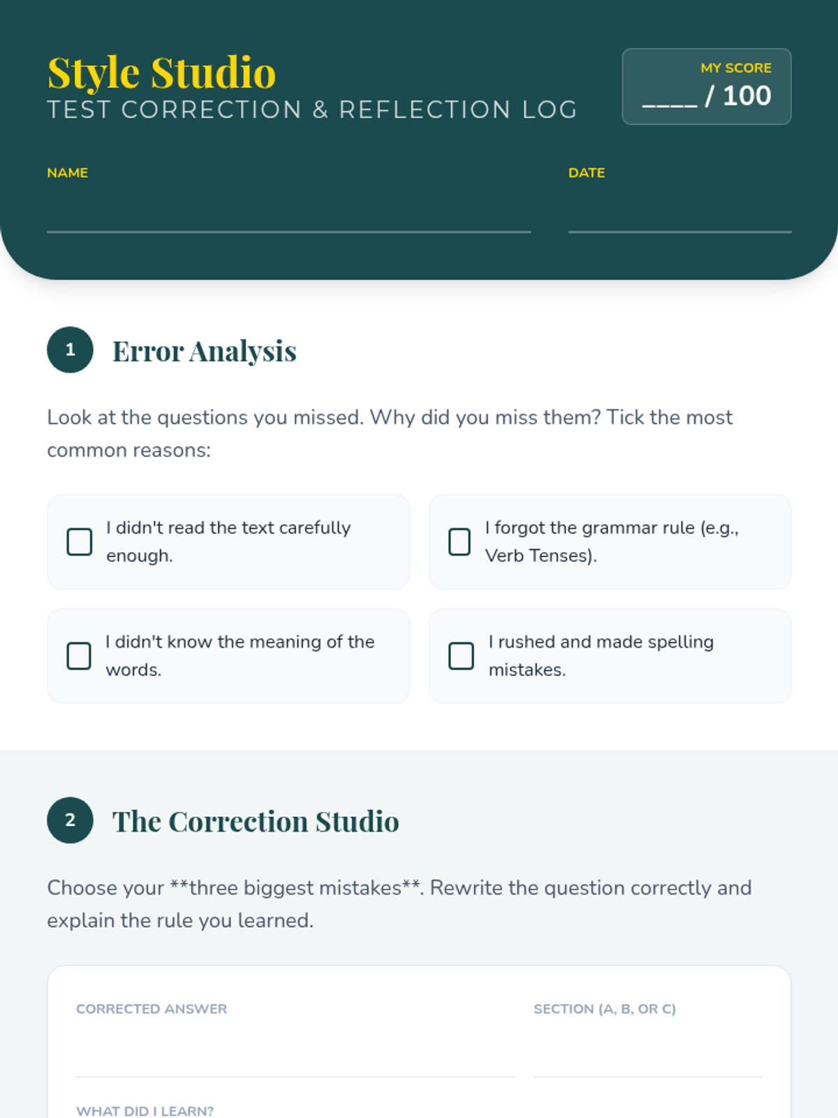 A final proofreading assessment where students must find and correct multiple errors in a dense text.