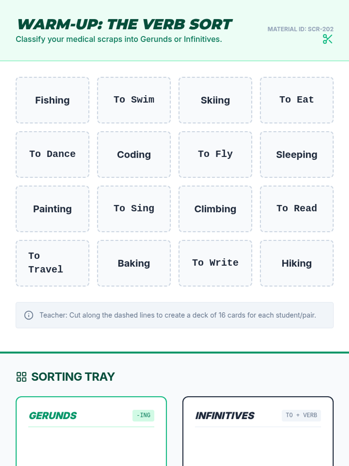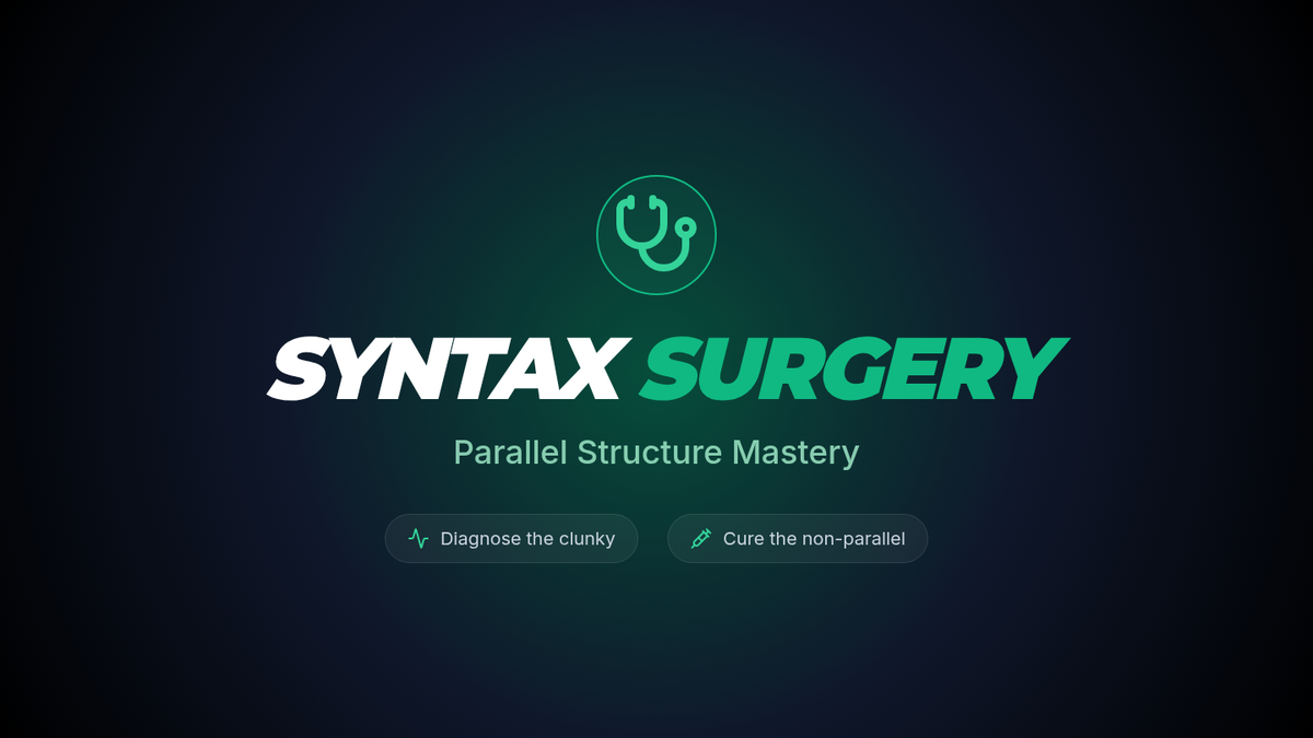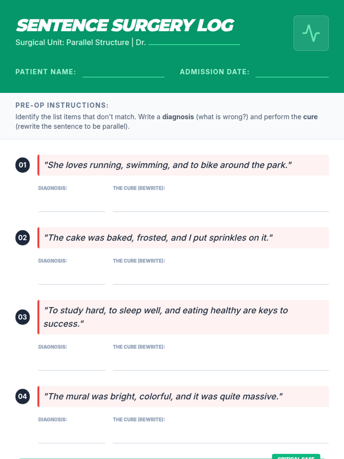A remedial high school English lesson focusing on parallel structure with gerunds and infinitives. Students act as 'sentence doctors' to diagnose and fix non-parallel lists using a medical-themed 'Sentence Surgery' activity.