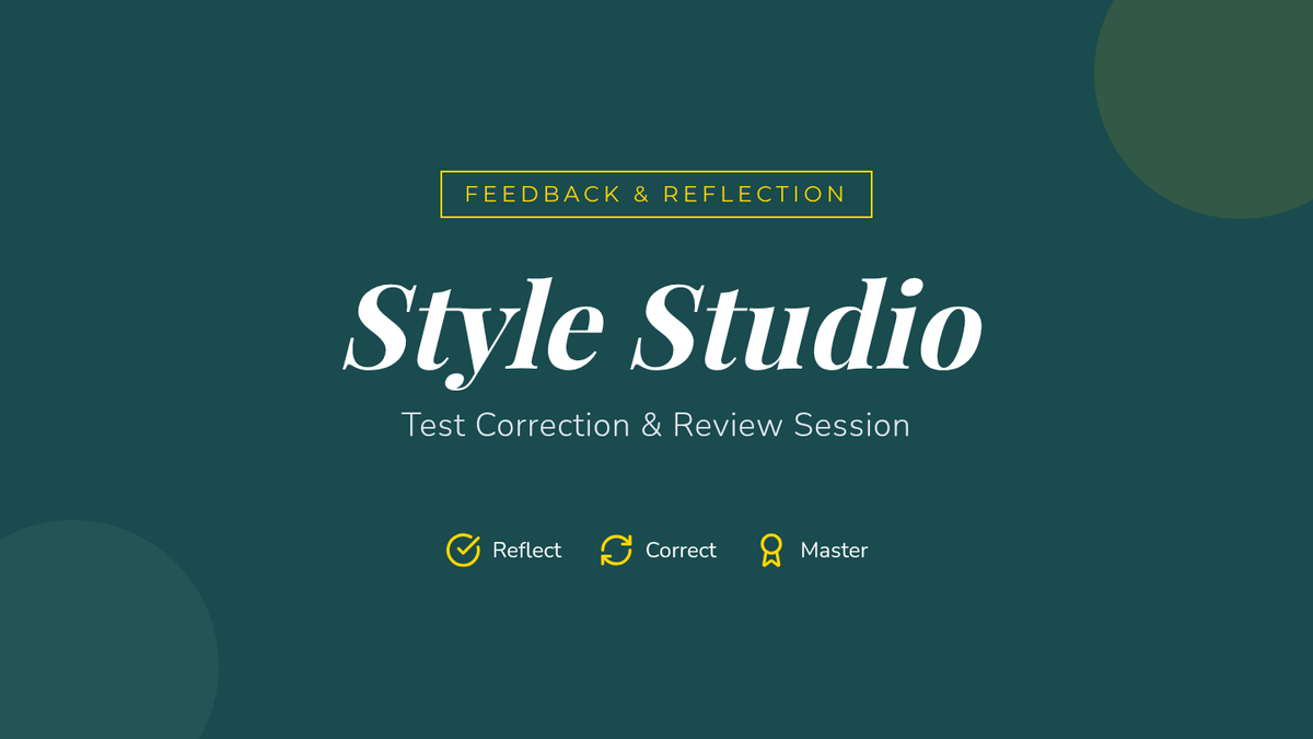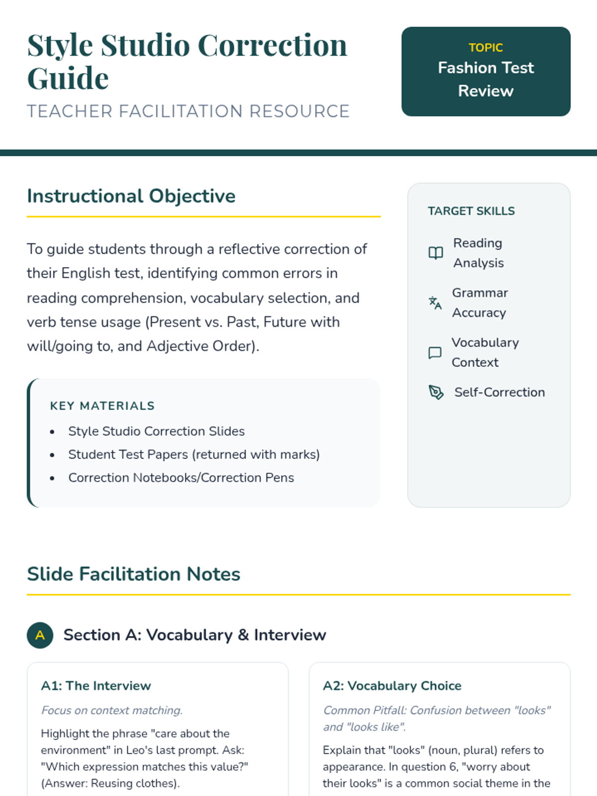 A comprehensive review lesson designed to guide students through the correction of their English fashion test, focusing on reading comprehension, grammar tenses, and vocabulary.