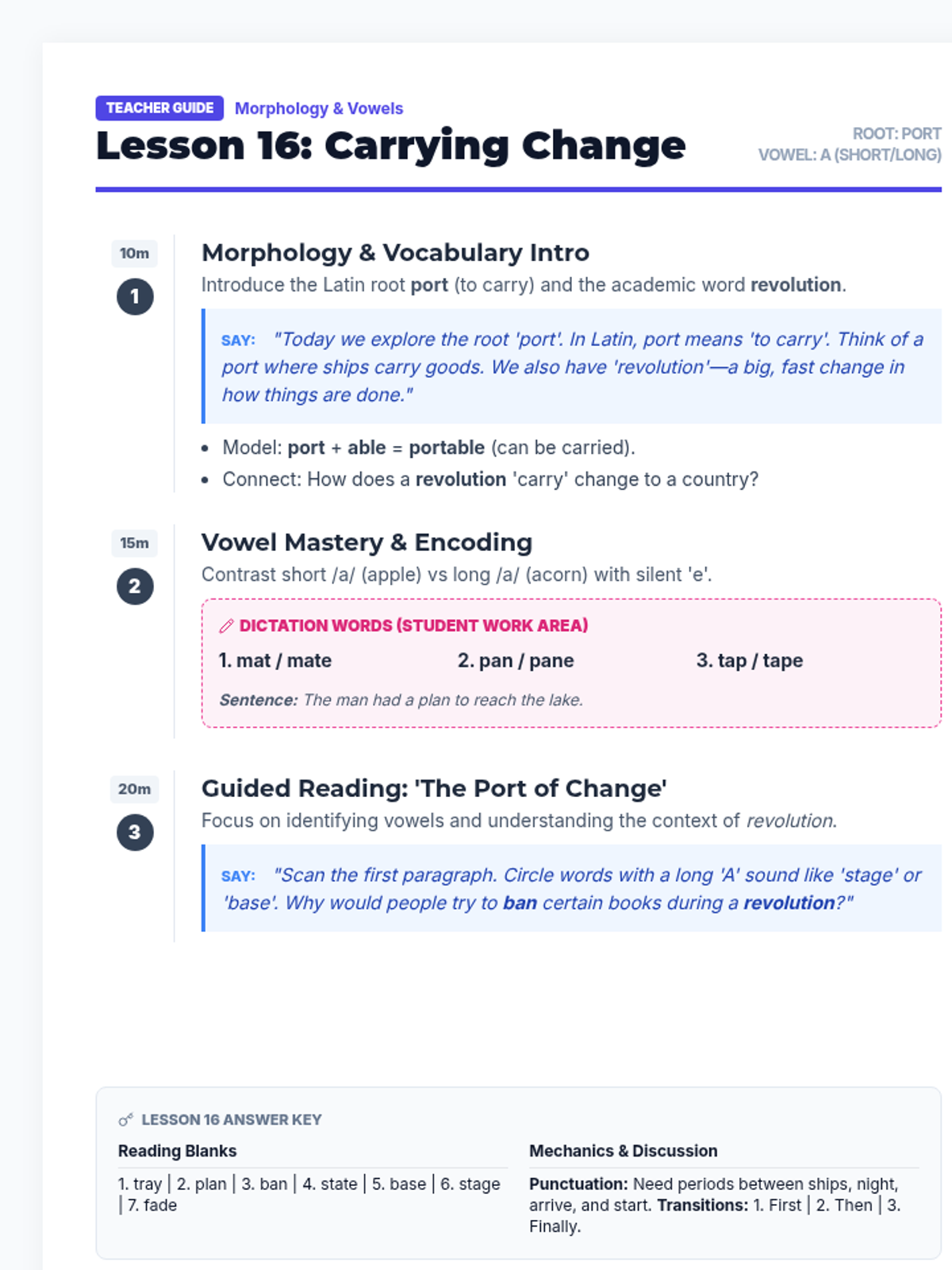 Teacher-facing resources including pacing guides, instructional scripts, and complete answer keys for Lessons 16-25.