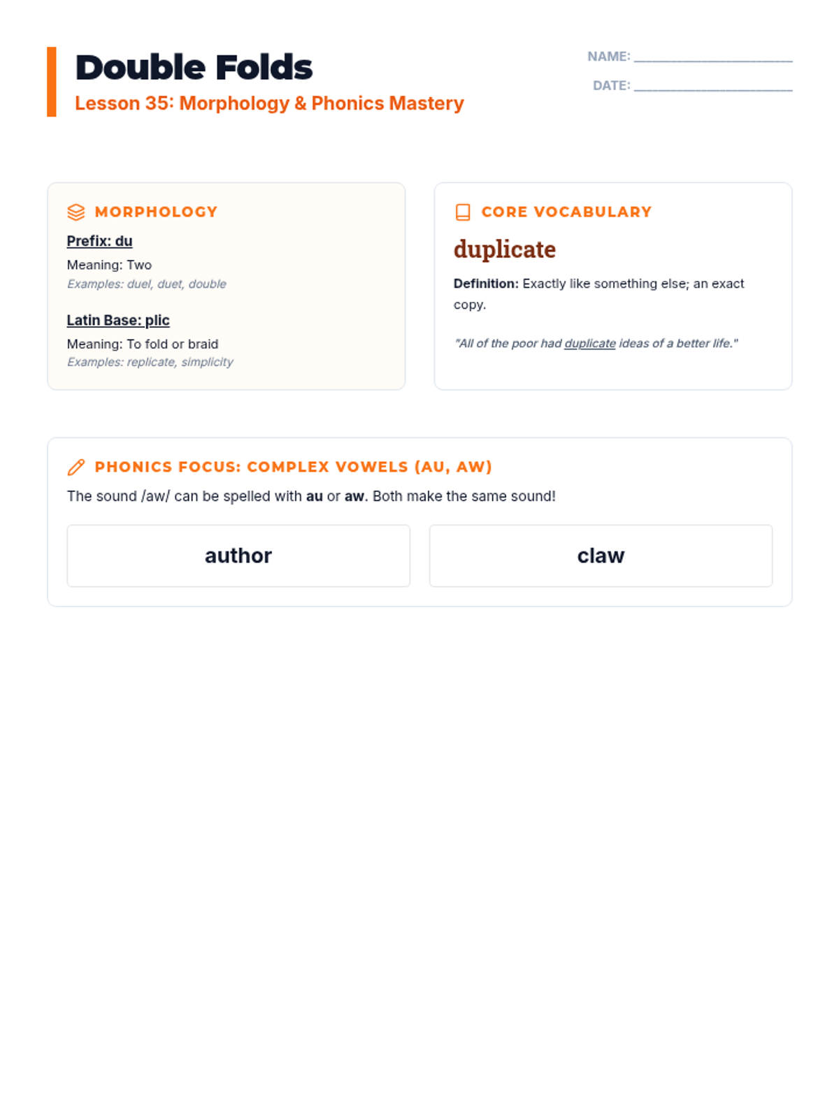 Focuses on the prefix du and root plic, with the vocabulary word 'duplicate'. Teaches diphthongs au and aw.
