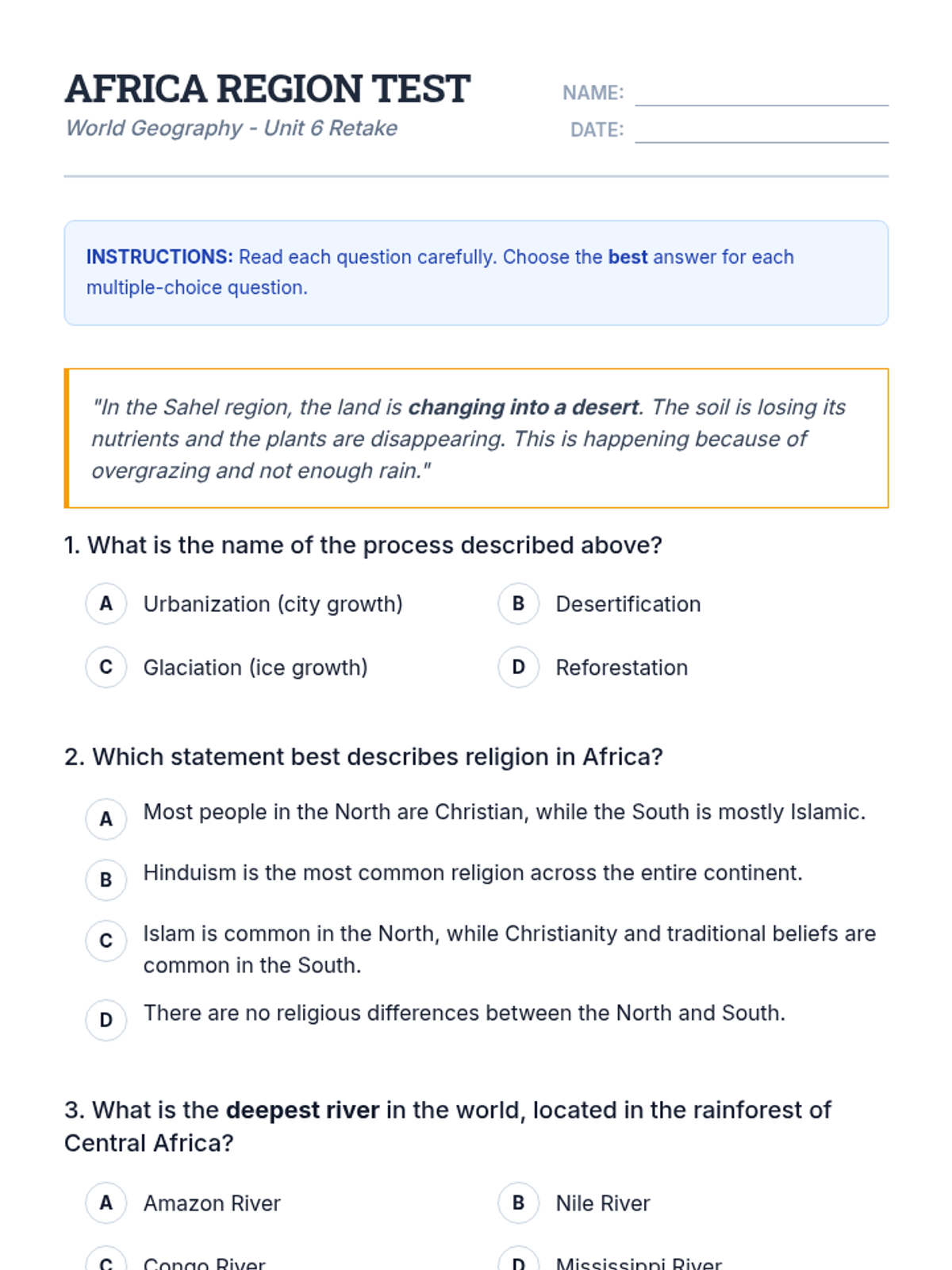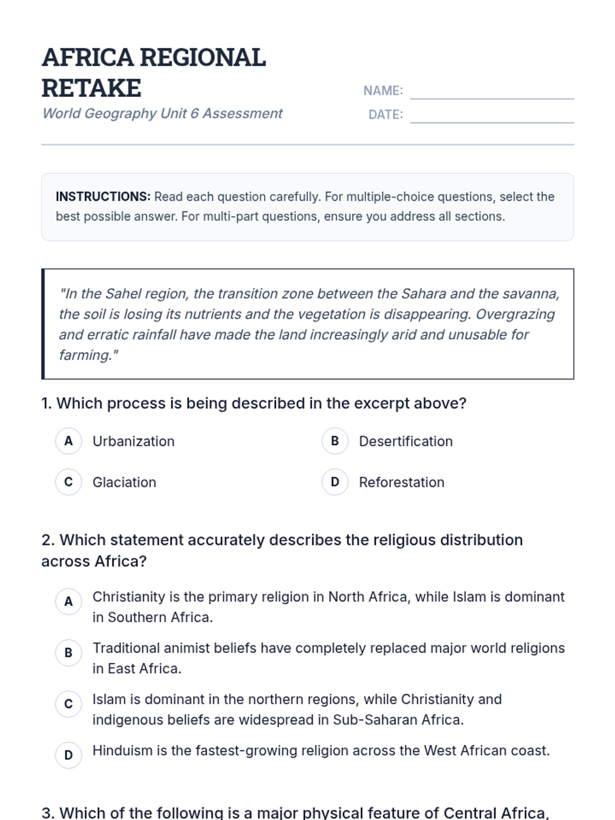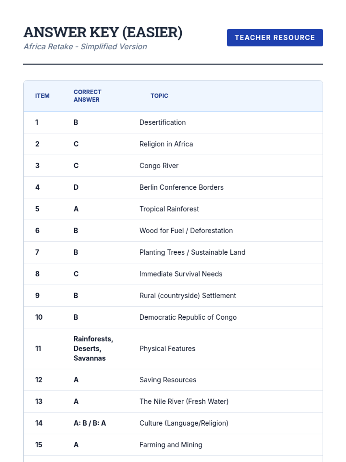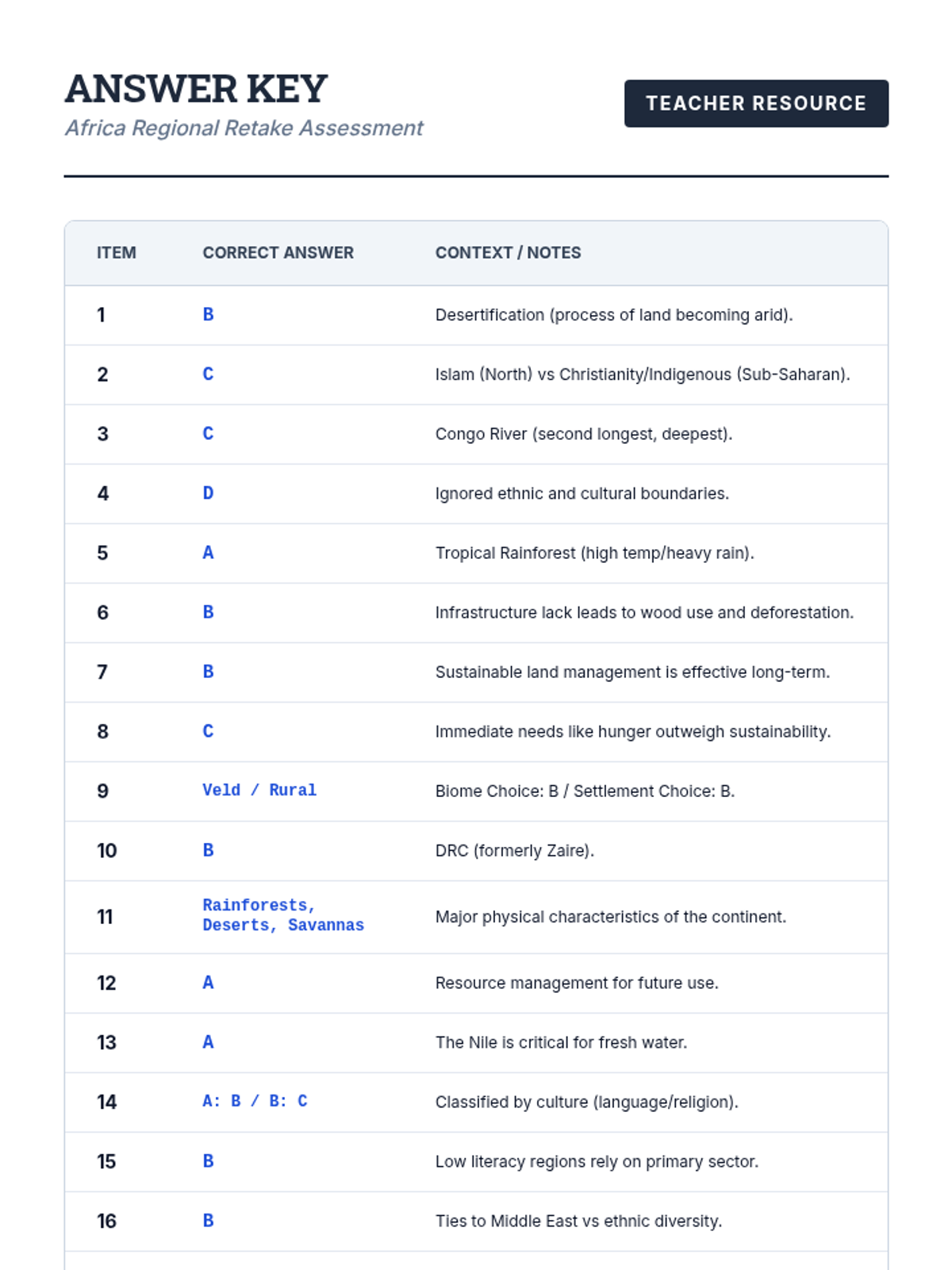 A comprehensive retake assessment for the Unit 6 Africa unit, covering physical geography, human systems, and contemporary issues. Includes a student test and a teacher answer key aligned with the original assessment standards.