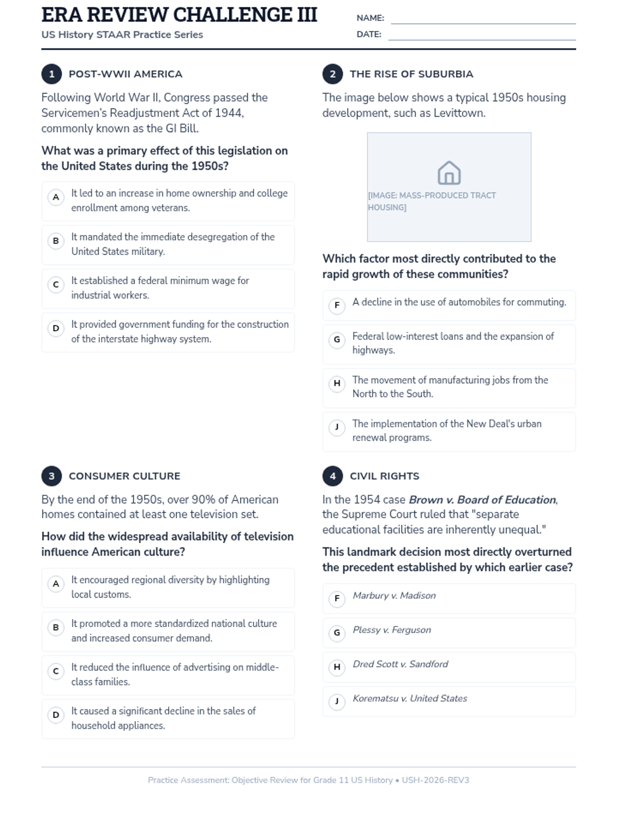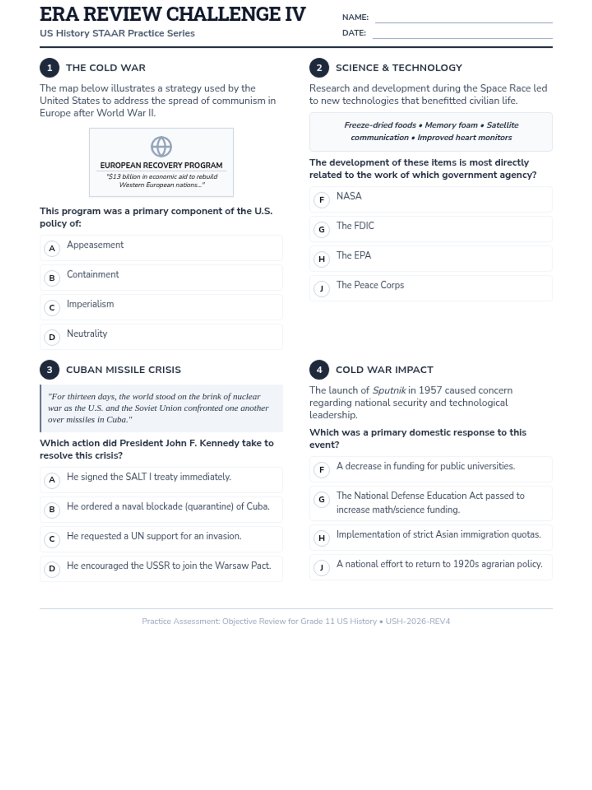 A 100-minute station-based lesson covering pivotal events from the 1970s to the modern era, including Stagflation, the Camp David Accords, Reaganomics, and the War on Terror. Students rotate through four 20-minute missions using primary sources, political cartoons, data mapping, and manipulatives to master STAAR-aligned content.