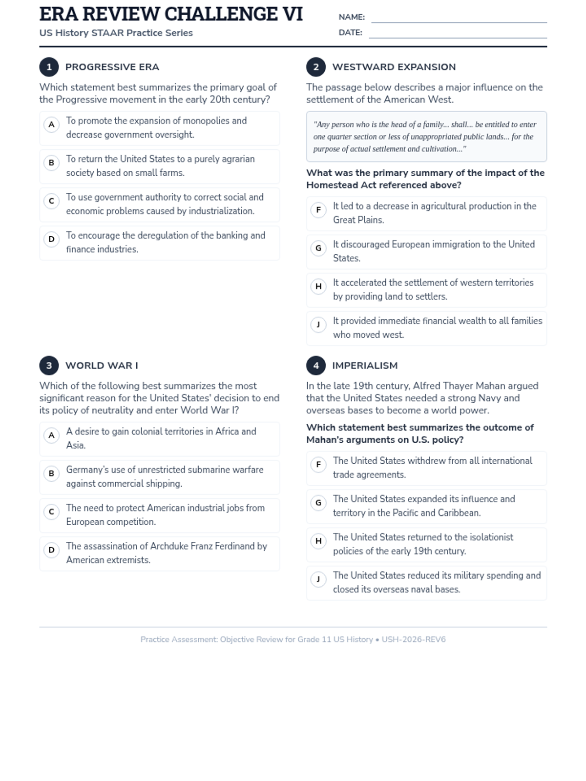 A comprehensive assessment set covering American expansionism (Imperialism) and the U.S. involvement in World War I, aligned with high school TEKS standards.