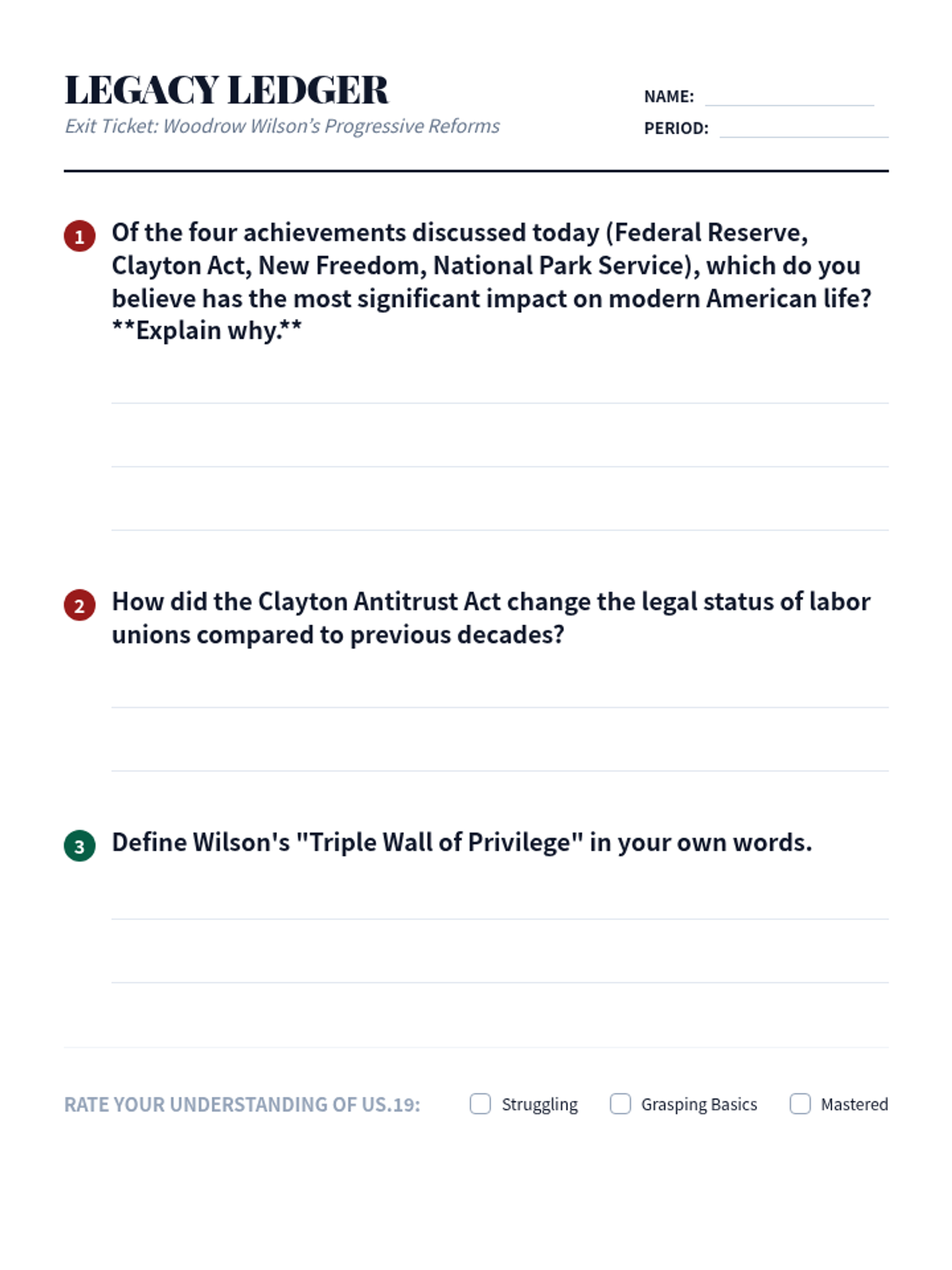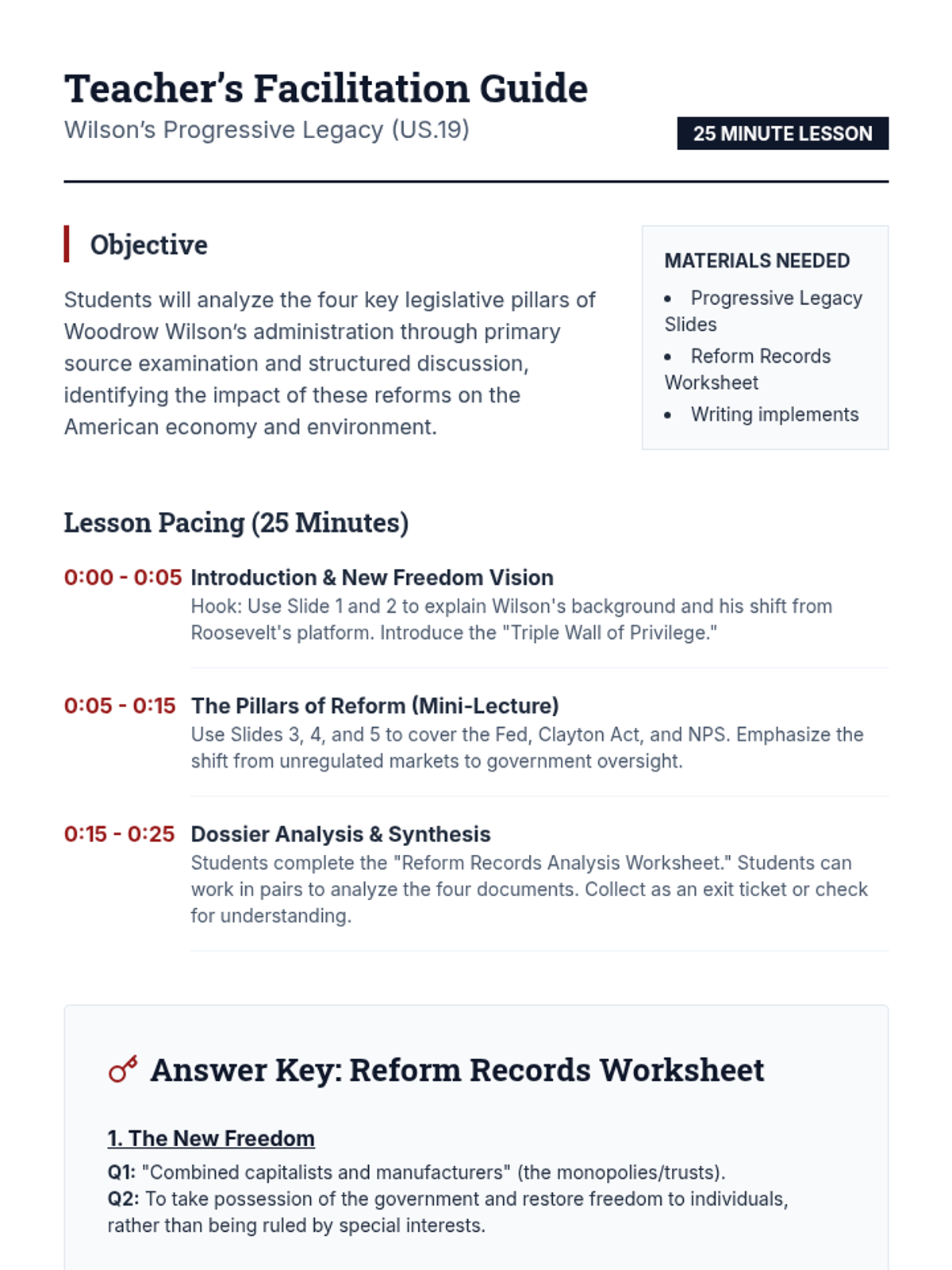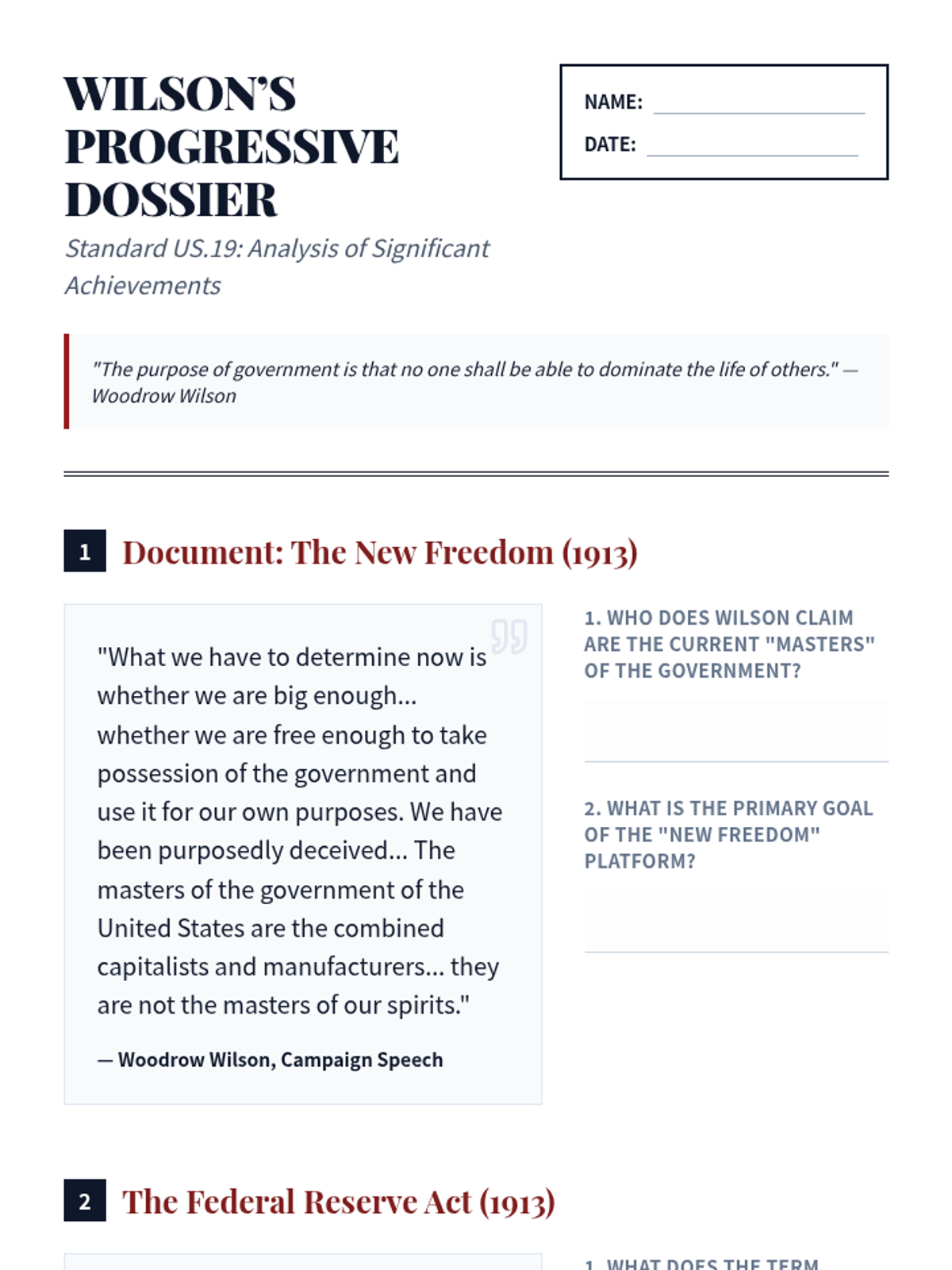 This lesson analyzes the key progressive achievements of Woodrow Wilson's presidency, including the New Freedom platform, the Federal Reserve Act, the Clayton Antitrust Act, and the creation of the National Park Service. Students will engage with primary sources to understand the economic, political, and environmental impact of these reforms.