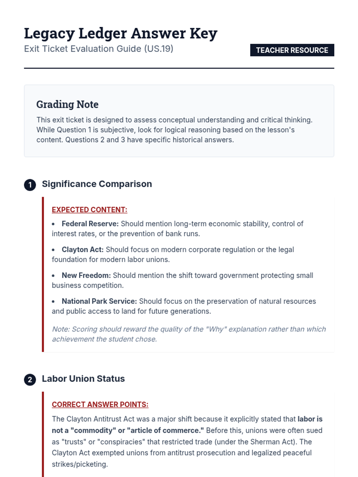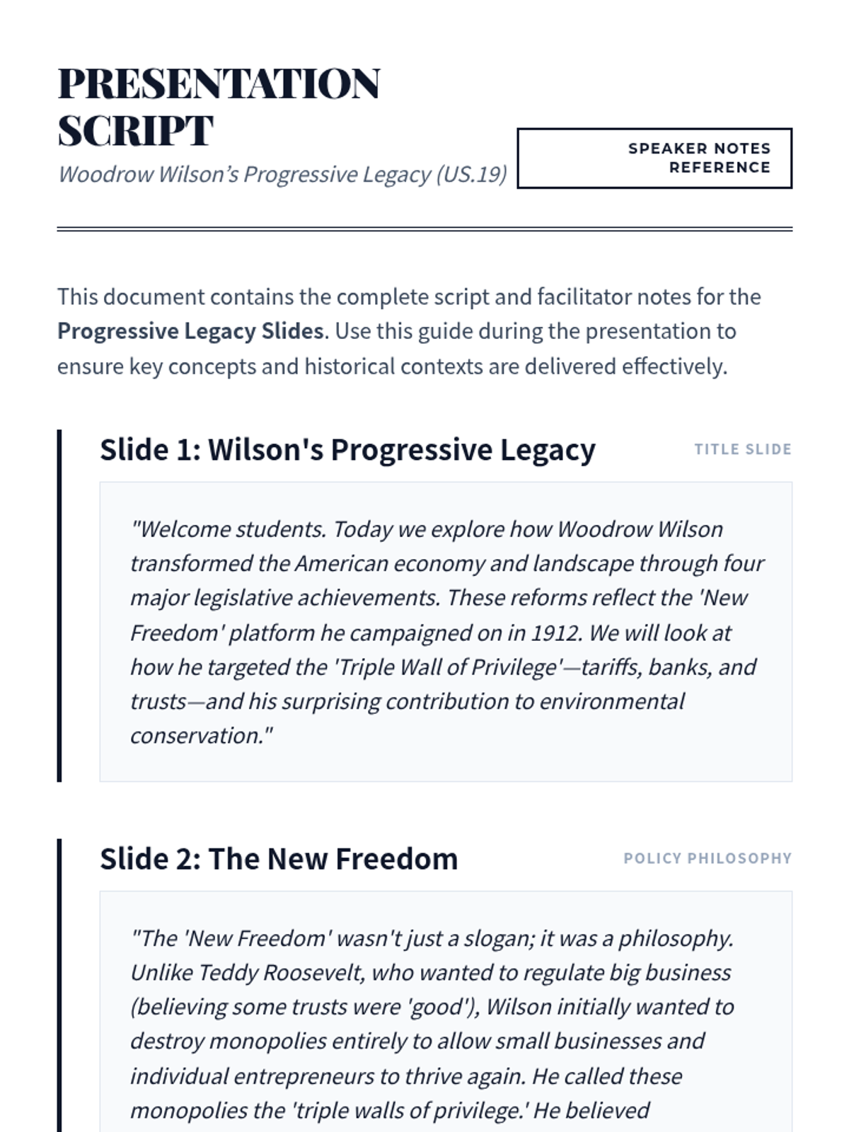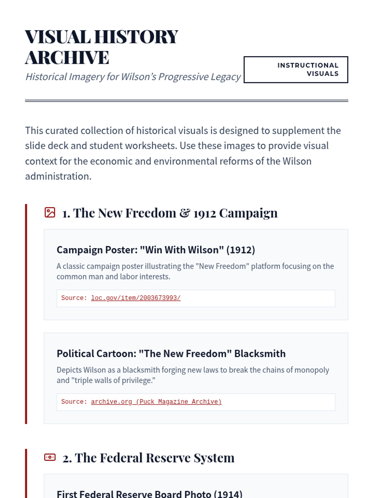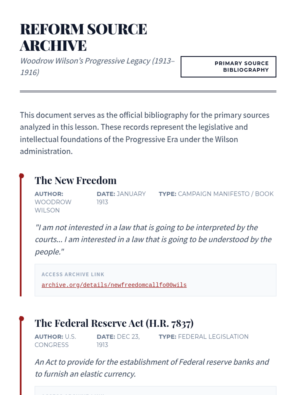 This lesson analyzes the key progressive achievements of Woodrow Wilson's presidency, including the New Freedom platform, the Federal Reserve Act, the Clayton Antitrust Act, and the creation of the National Park Service. Students will engage with primary sources to understand the economic, political, and environmental impact of these reforms.